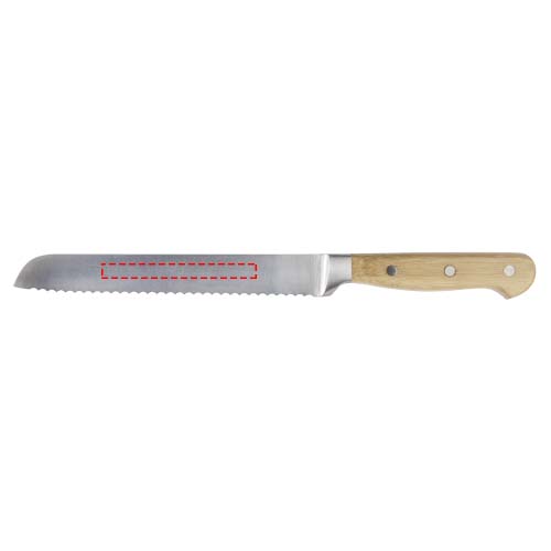 Bamboo cutting board including a bread knife with bamboo handles. The horizontal open pattern allows crumbs to fall through to the tray below, keeping your workspace or dining table crumb-free. Knife size: 34 cm x 3 cm. The bamboo was sourced and produced following sustainable standards.
