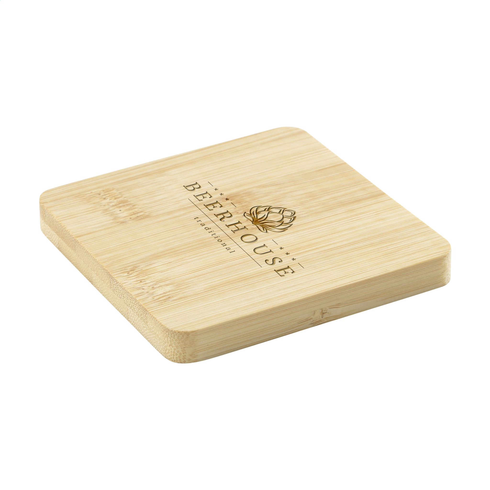 Square bamboo coaster with metal bottle opener in the bottom. Practical and multifunctional. Bamboo is a natural material. As a result, the colour may vary per product.