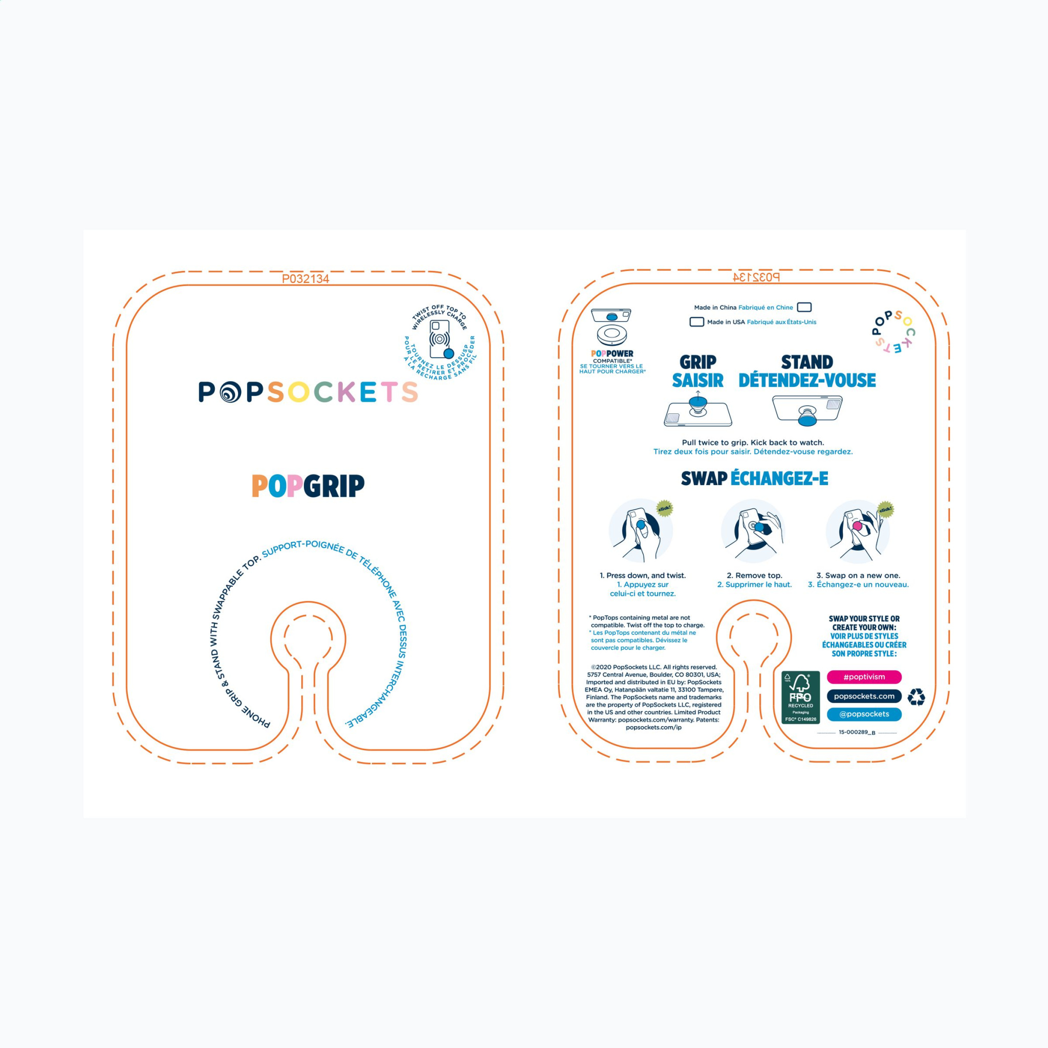 The PopSocket® is a handy multifunctional telephone accessory. With new swappable plastic PopGrip and swappable PopTop. This PopGrip is compatible with wireless charging thanks to the easy removal of the PopTop. Attach this item to the back of your phone with the 3M adhesive strip and use the handy functions: comfortable grip for better hold, functional stand and selfie-holder. Can be placed in 2 different pop-up positions and flexible so you can position the smartphone any way you like. The PopSocket® is easy to remove and can be reused up to 10 times. Suitable for all commonly used types of smartphones, iPhones and other devices. Read the supplied instructions for optimal use and maintenance of the PopSocket®. Extra info regarding delivery time: 60 - 2,500 units: 1 week, 2,500 - 5,000 units: 2 weeks. More than 5,000 units, price and delivery time upon request. PopSockets® are only available with an imprint.