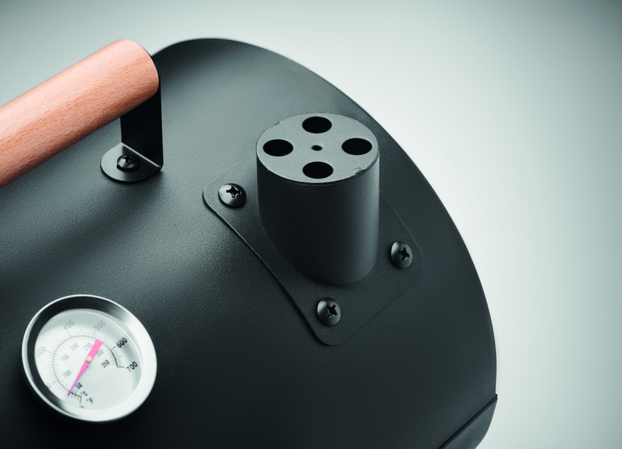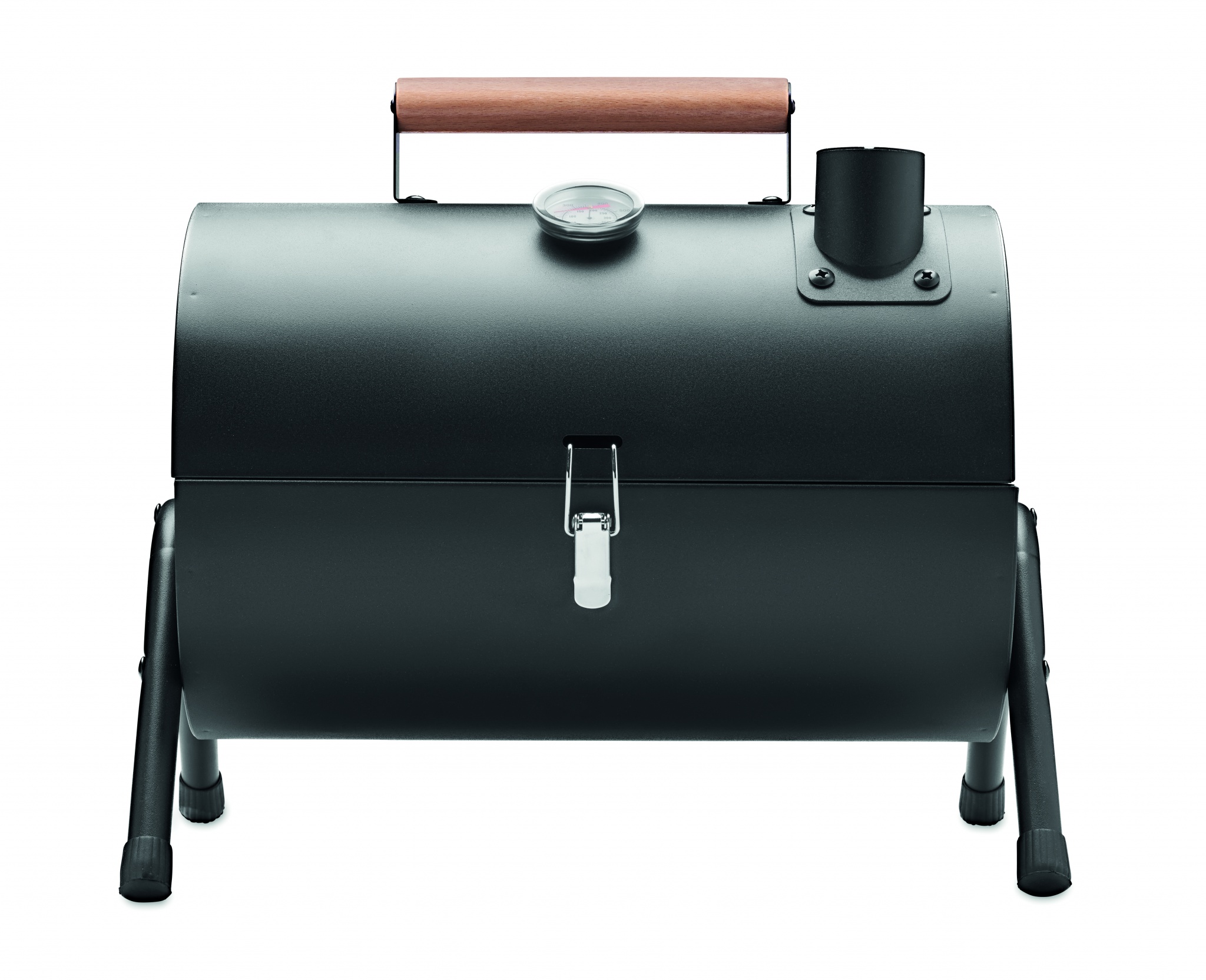 Portable barbecue barrel in iron with chimney and temperature gauge. Black firebox. Locking catch and wooden carry handle.