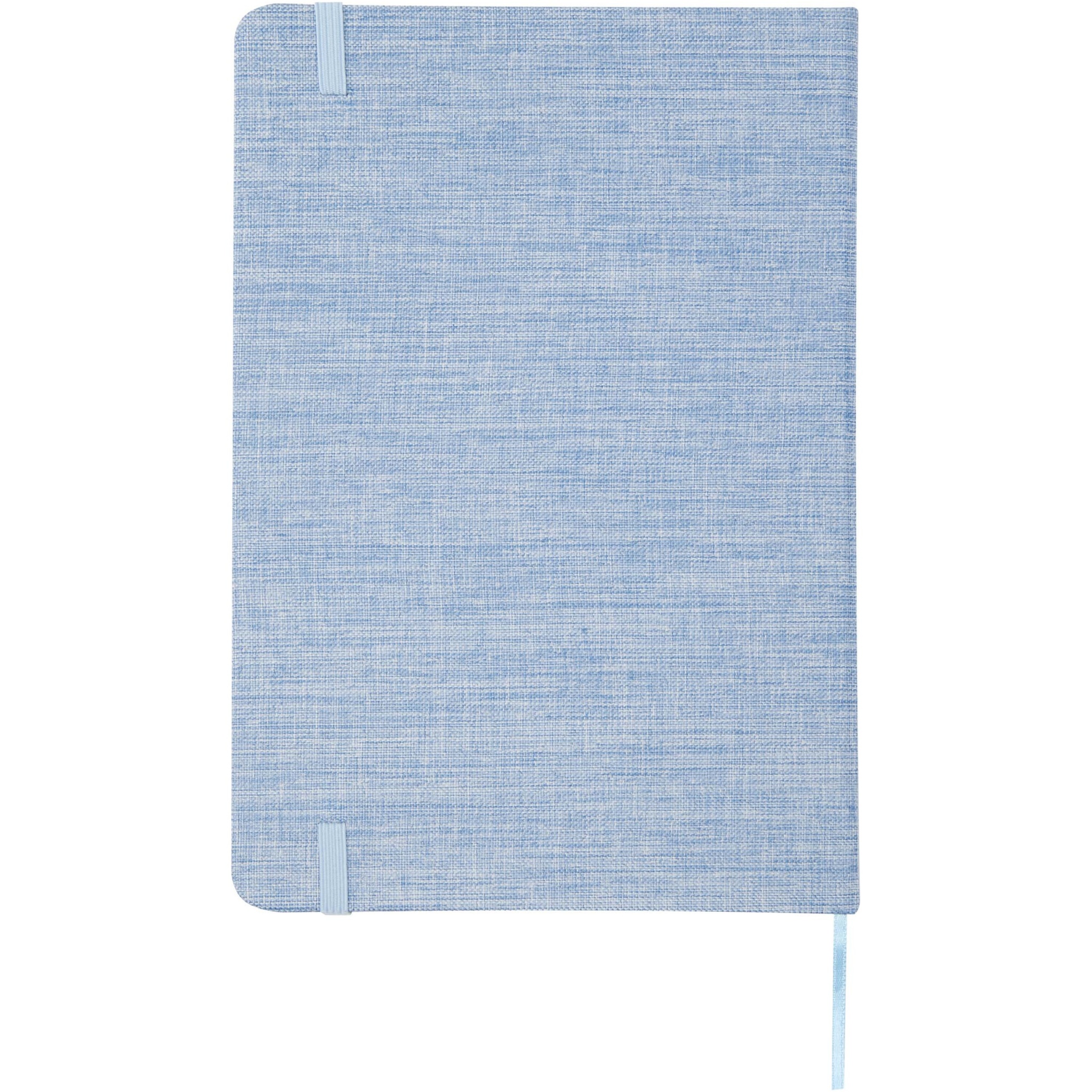 Hard cover A5 notebook made of recycled cotton with 80 lined sheets of 70 g/m² paper. The notebook has an elastic closure, a ribbon, and rounded corners.