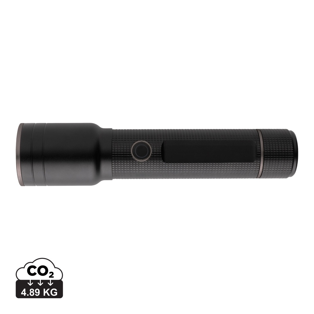 Functionality, performance and design all come together in this re-chargeable 10W torch made with RCS certified recycled aluminum. Total recycled content: 20% based on total item weight. RCS certification ensures a completely certified supply chain of the recycled materials. Because of its IP4 rating, it is weatherproof so can easily be taken outside. The powerful bulb creates up to 1500 lumen and a beam that reaches up to 800 metres. The torch uses a re-chargeable A-grade battery so no need to replace the batteries. Simply re-charge via your USB socket and the included RCS certified recycled type C cable. The high quality bulb comes with 5 modes including SOS function. The 4000 mah battery allows a usage up to 10 hours on a single charge and allows charging your mobile devices via type C. Aluminum does not lose its characteristics in the recycling process and can be recycled endlessly. Item and accessories 100% PVC free. Packed in FSC mix packaging. Input Type-C 5V, 1A; Output 5V, 1A