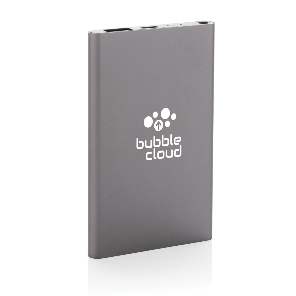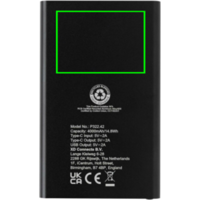 4.000 mAh flat design powerbank with the case made out of RCS certified recycled Aluminum/ABS plastic. RCS (Recycled Claim Standard) is a standard to verify the recycled content of a product throughout the whole supply chain. Total recycled content: 36 % based on total item weight. The powerbank supports both charging via USB A as well as type C. The powerbank contains a long lasting grade A 4.000 mAh lithium polymer battery. The power indicators will indicate the remaining energy level so you always know when to re-charge.; Type-C Input 5V/2A; Type C output:5V/2A USB A output: 5V/2A. Item and accessories PVC free. Including RCS certified recycled TPE charging cable. Packed in FSC® mix packaging.