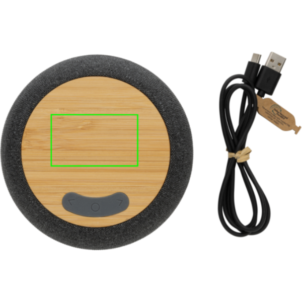 5W wireless speaker with crystal clear sound. Made with FSC® 100% bamboo, RCS (Recycled Claim Standard) certified recycled ABS and PET. Total recycled content: 51% based on total item weight. RCS certification ensures a completely certified supply chain of the recycled materials.The speaker is equipped with a 1200 mAh battery to ensure up to 6 hours of playing time and BT5.3 for smooth connection and clear sound. Connection range up to 10 metres. With mic to answer calls. Packed in FSC® mix kraft box. Including GRS certified recycled TPE charging cable. Item and accessories 100% PVC free.