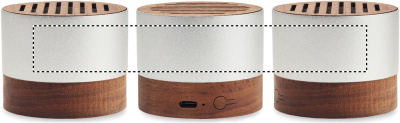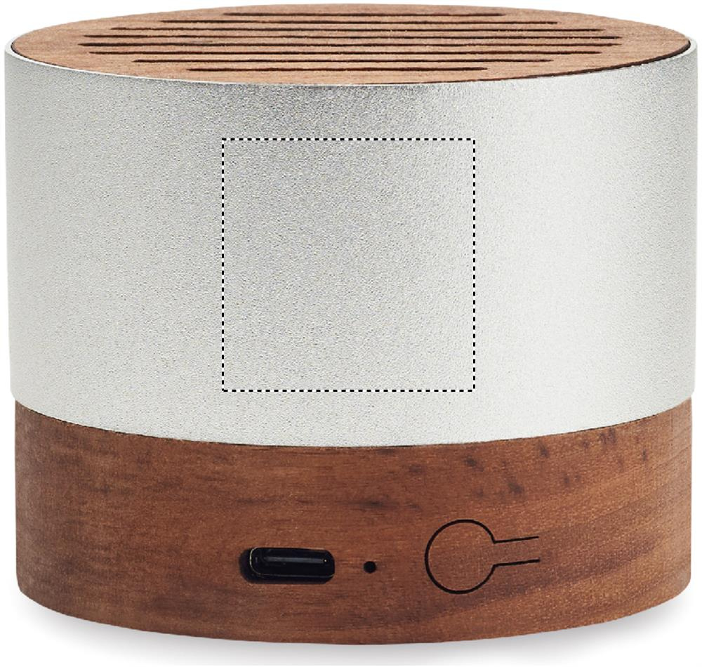 5.3 wireless speaker in recycled aluminium casing with walnut base and top detail. 1 Rechargeable Li-ION 300 mAh battery included. Output data: 3W, 3 Ohm and 5V. Playing time approx. 3h.