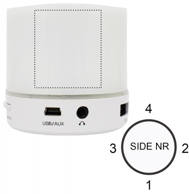 2.1 wireless speaker with LED light indication in ABS. 3 colours changing light. 1 Rechargeable Lithium 450 mAh battery included. Includes a SD card port and an AUX/ USB cable. Hands free call function. Output data: 3W, 4 Ohm. Playing time aprox. 2h.