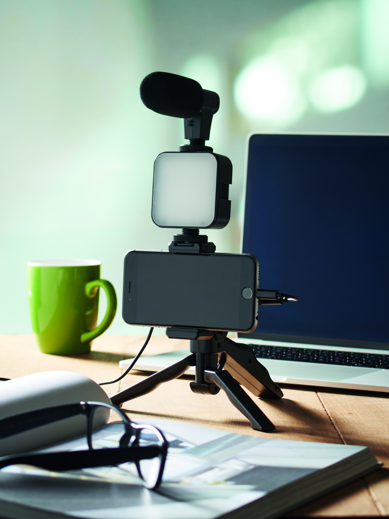 Smartphone video kit. Including adjustable desk top tripod with phone mount Shot gun microphone and audio cable and 3.5mm jack adapter. LED light with 10 light settings. Excluding 2 x Type-AA batteries.