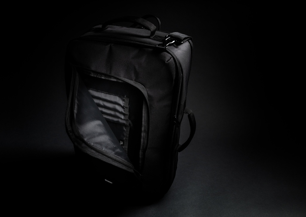 Break barriers using the convertible backpack. Functional organisation and business features ensure this backpack will be an everyday choice. 4-1 Convertibility: 1. Backpack: Clip the padded straps to the secure rings and adjust the fit to create backpack mode. 2. Shoulder: Unclip and tuck the backpack straps inside the sleeve, attach and adjust the shoulder strap to comfortably carry on the shoulder. 3. Crossbody: When packed full, adjust the shoulder strap to wear across the body for a more comfortable, secure, hands free commuting mode. 4. Hand Held: Tuck the backpack straps and remove the shoulder strap, carry by either the top or side handle for a hand held option. With 15.6" dedicated laptop compartment in the back. Large main compartment for travel goods and front zippered pocket for all tech accessories. Including RFID protected sleeves and trolley luggage strap. PVC free.