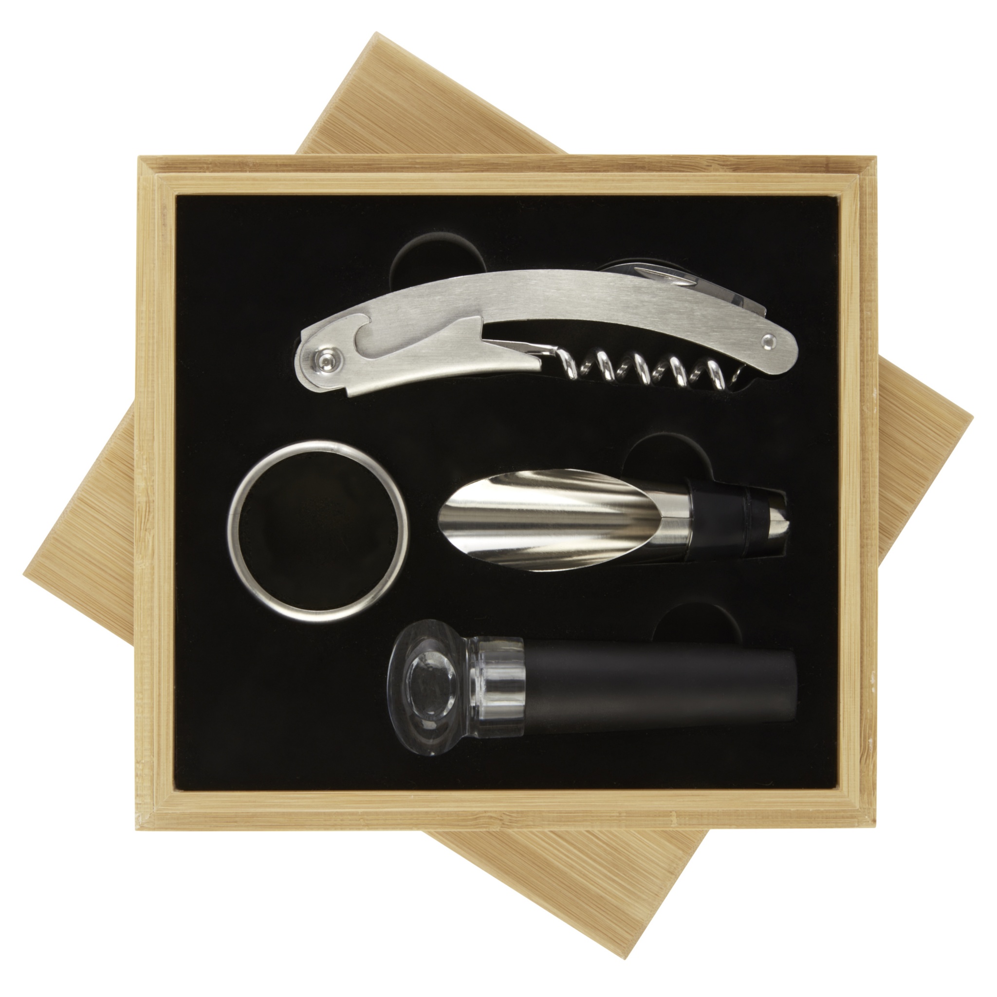 4-piece wine set including a waitress corkscrew, a stopper, a pourer and a ring. Delivered in a bamboo gift box sourced and produced following sustainable standards.