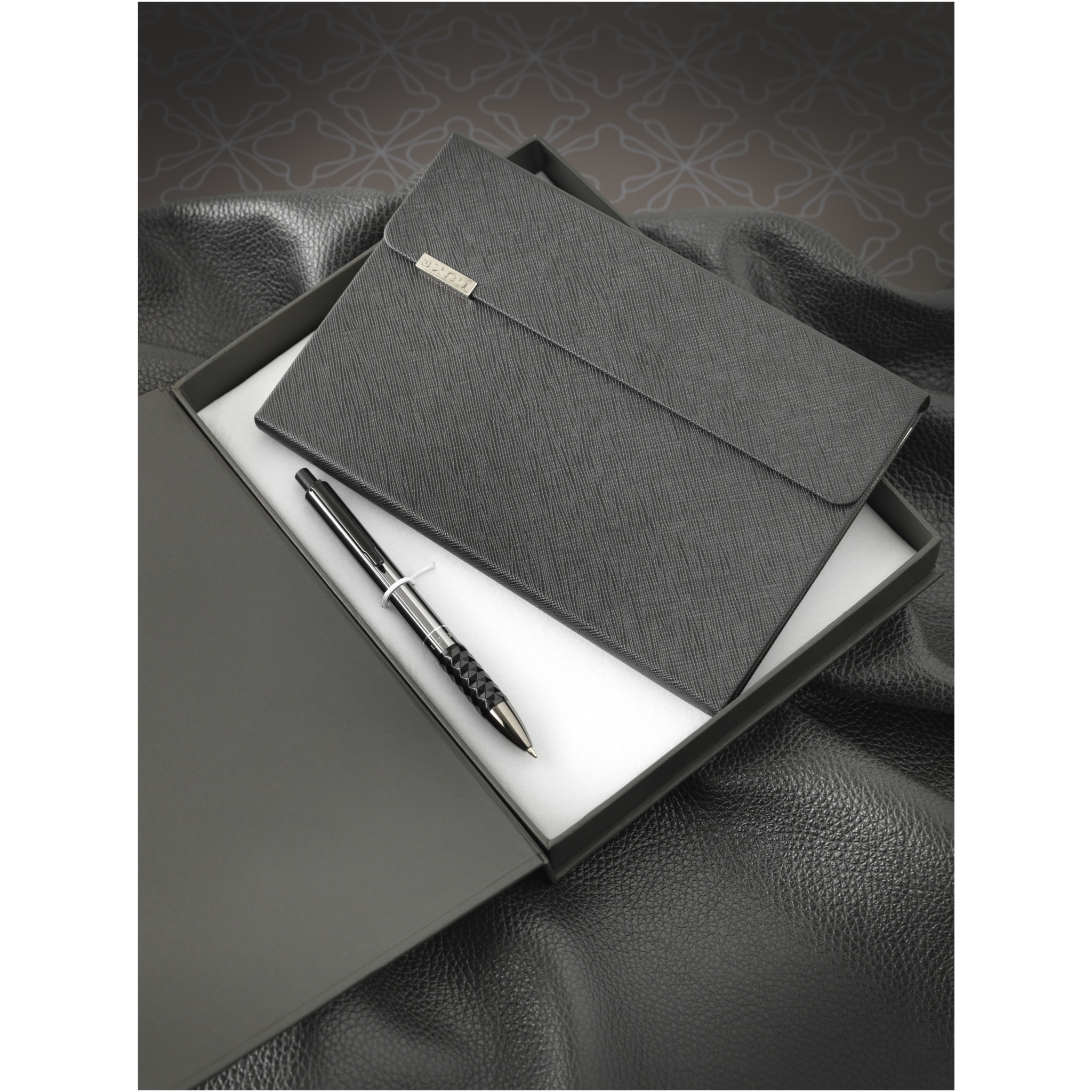 Exclusive A5 sized design notebook with Thermo PU cover, black ribbon page marker, magnetic closure and 80 sheets of 80gsm cream lined paper. Paired with the Tactical click action ballpoint pen. Both items packed in a ''LUXE'' gift box. Size notebook: 13.5 x 20.5 cm. Length pen: 14 cm. Diameter pen: 1.05cm.