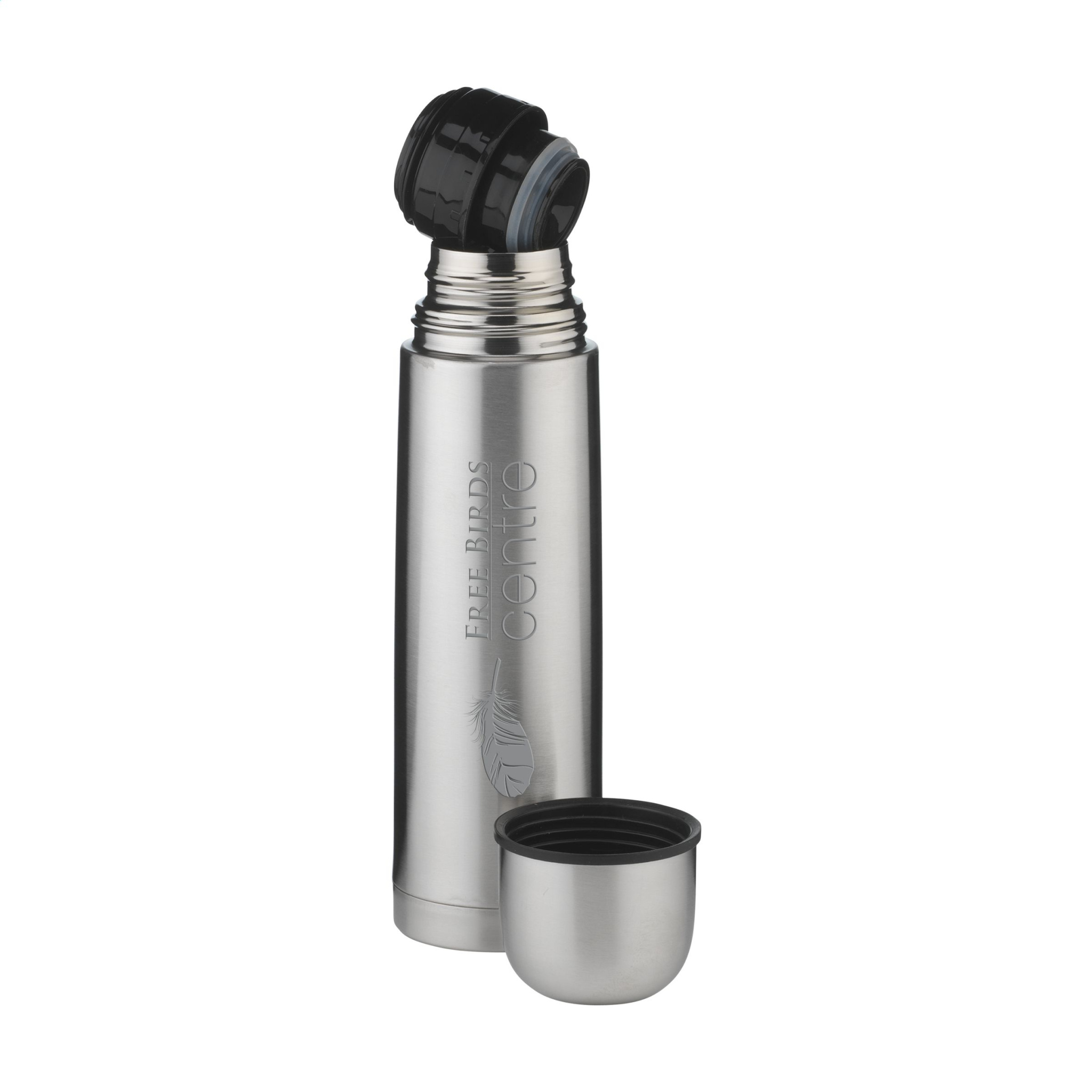 Double-walled, vacuum-insulated, stainless steel thermo bottle. Extremely durable and unbreakable. The vacuum between the walls insulates the contents and keeps drinks hot or cold for a longer period of time. With screw cap/drinking cup and handy push-pour system. Leak proof. Capacity 500 ml. Each item is individually boxed.