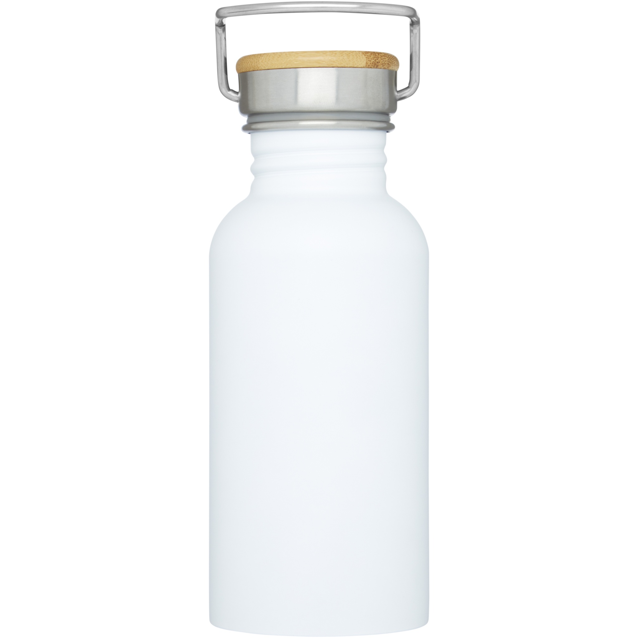 Single-walled stainless steel bottle with screw-on lid. The lid features a bamboo top, as well as a handle for easy carrying. Volume capacity is 550 ml. Presented in an Avenue gift box.