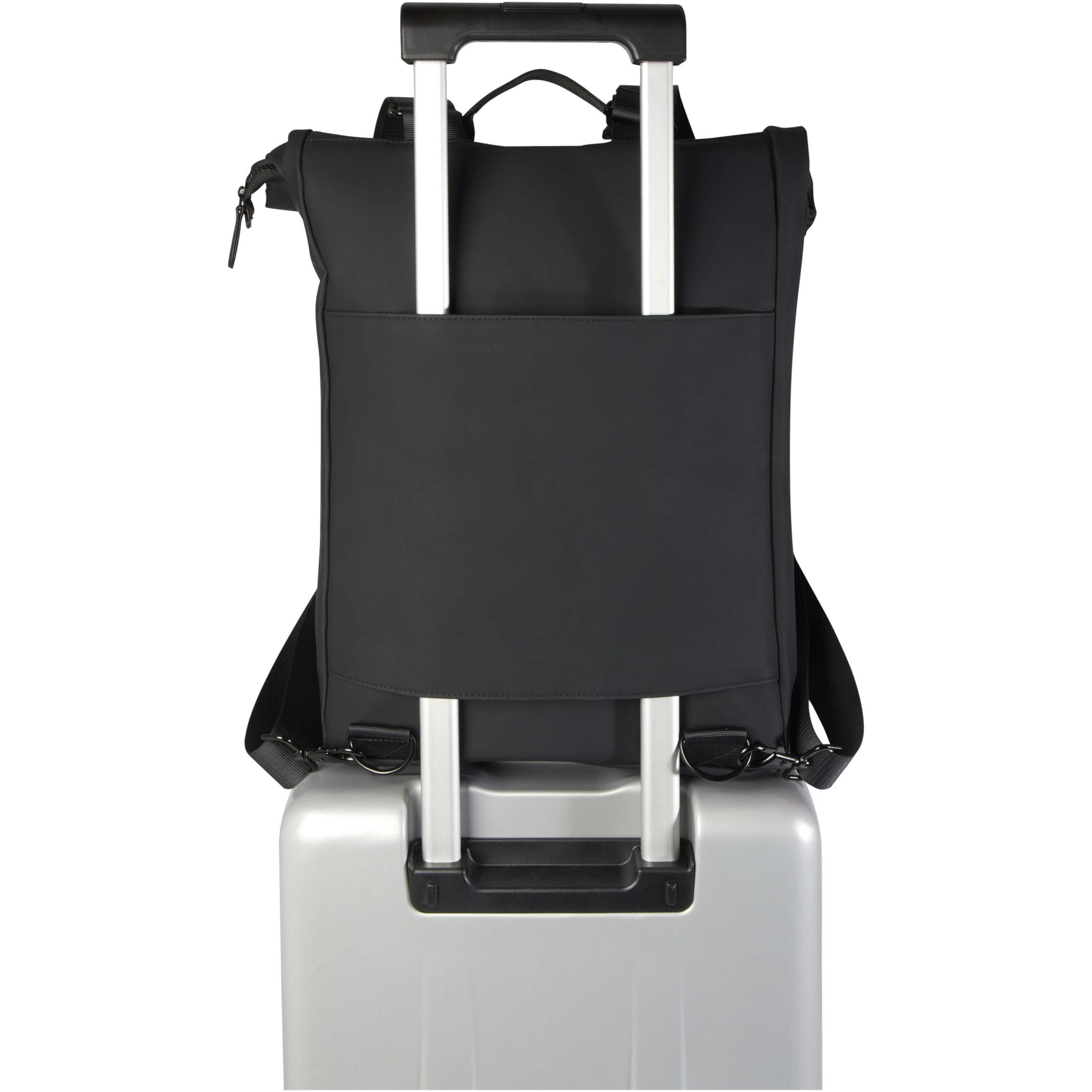 The Turner roll-top backpack is made of 51% GRS certified recycled plastic and the lining is made of 100% GRS certified RPET. The backpack features a padded 15.6" laptop compartment, a padded tablet compartment, an internal strap for securing a water bottle, and a zipped pocket for smaller items. The main compartment is designed with a roll-top closure, which can be securely fastened with a clasp. Additionally, a luggage strap on the back allows for easy attachment to rolling luggage, making it a convenient travel companion. Volume capacity: 12 litres.