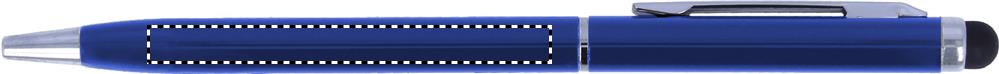 Twist action ball pen in aluminium with stylus and shiny chrome clip. Blue ink.