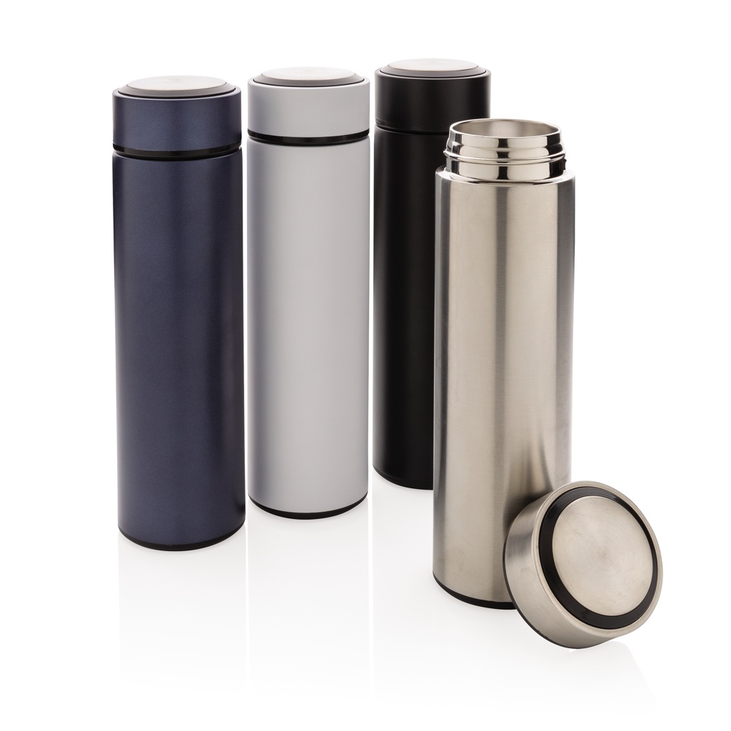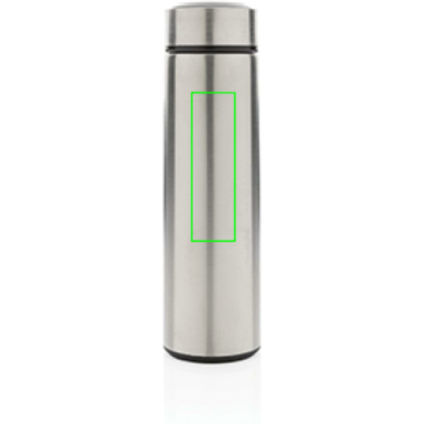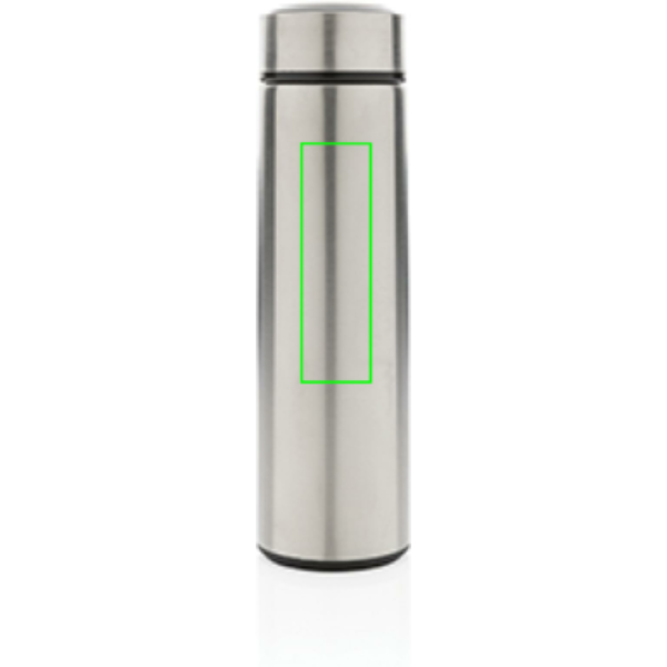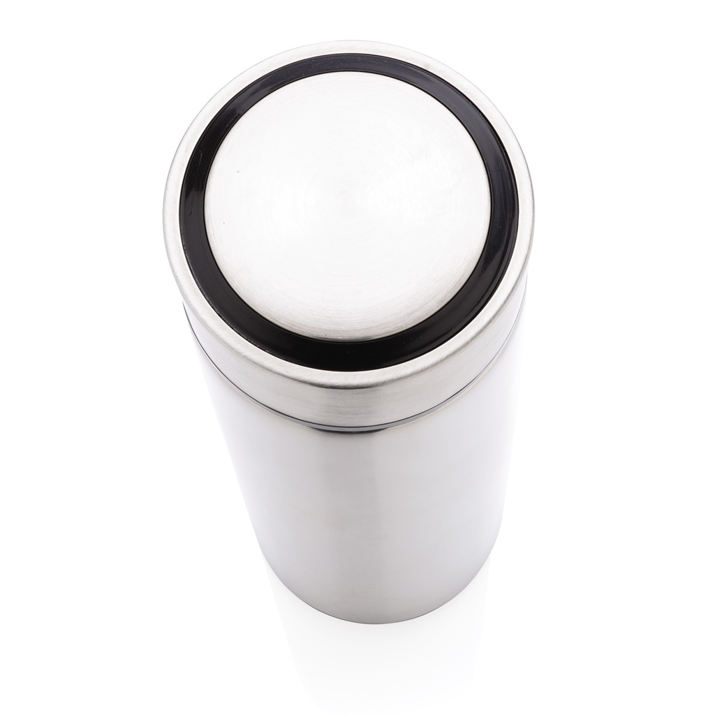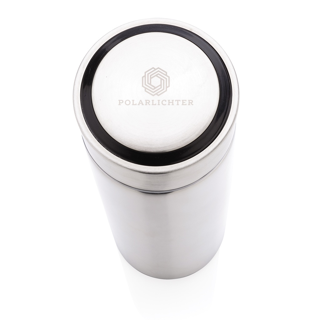 Keep coffee or tea nice and toasty in this vacuum stainless bottle with brushed metal lid. The bottle features a leak-proof screw lid and allows for drinking from any side. The wide mouth opening allows for easy cleaning. Capacity 450ml. BPA free.