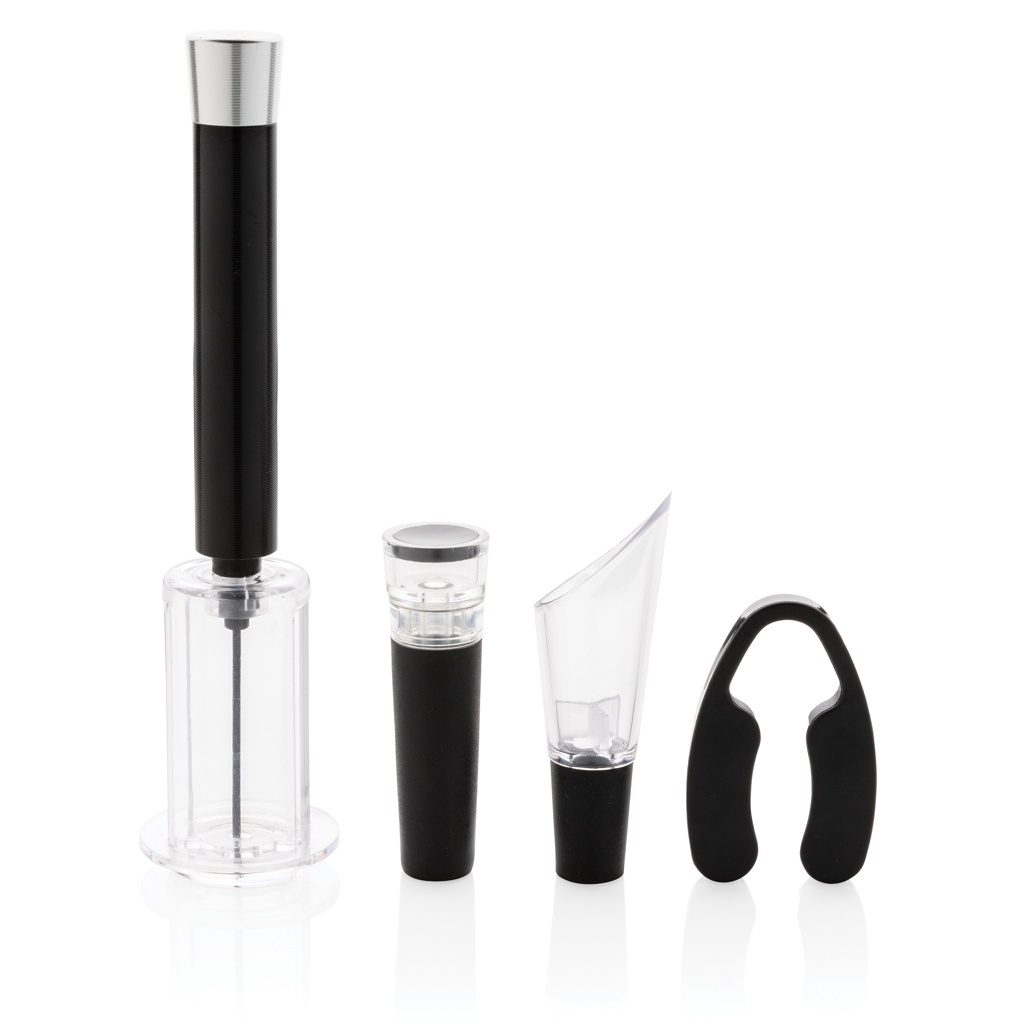 Have everything you need to open, serve and store your favourite wines with this 4 pcs wine set. The set consists of an air pump wine opener, foil cutter, wine stopper with vacuum pump & wine pourer with aerator. Packed in a luxury gift tube.
