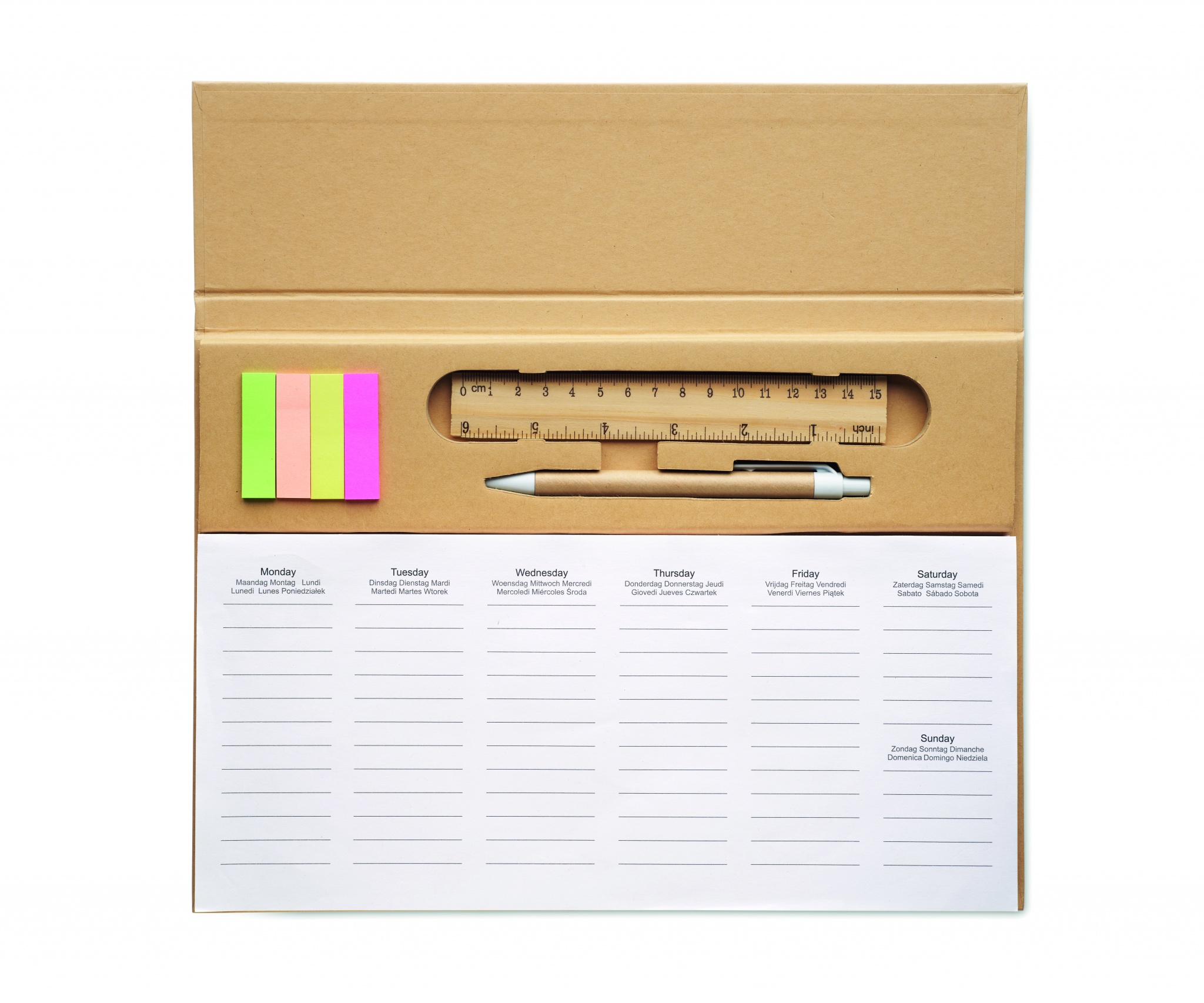 125 page weekly desk planner in 6 languages (EN/DE/FR/ES/IT/NL/PL) with kraft paper cover, carton barrel blue ink push button pen, wooden ruler and sticky note memo pad.