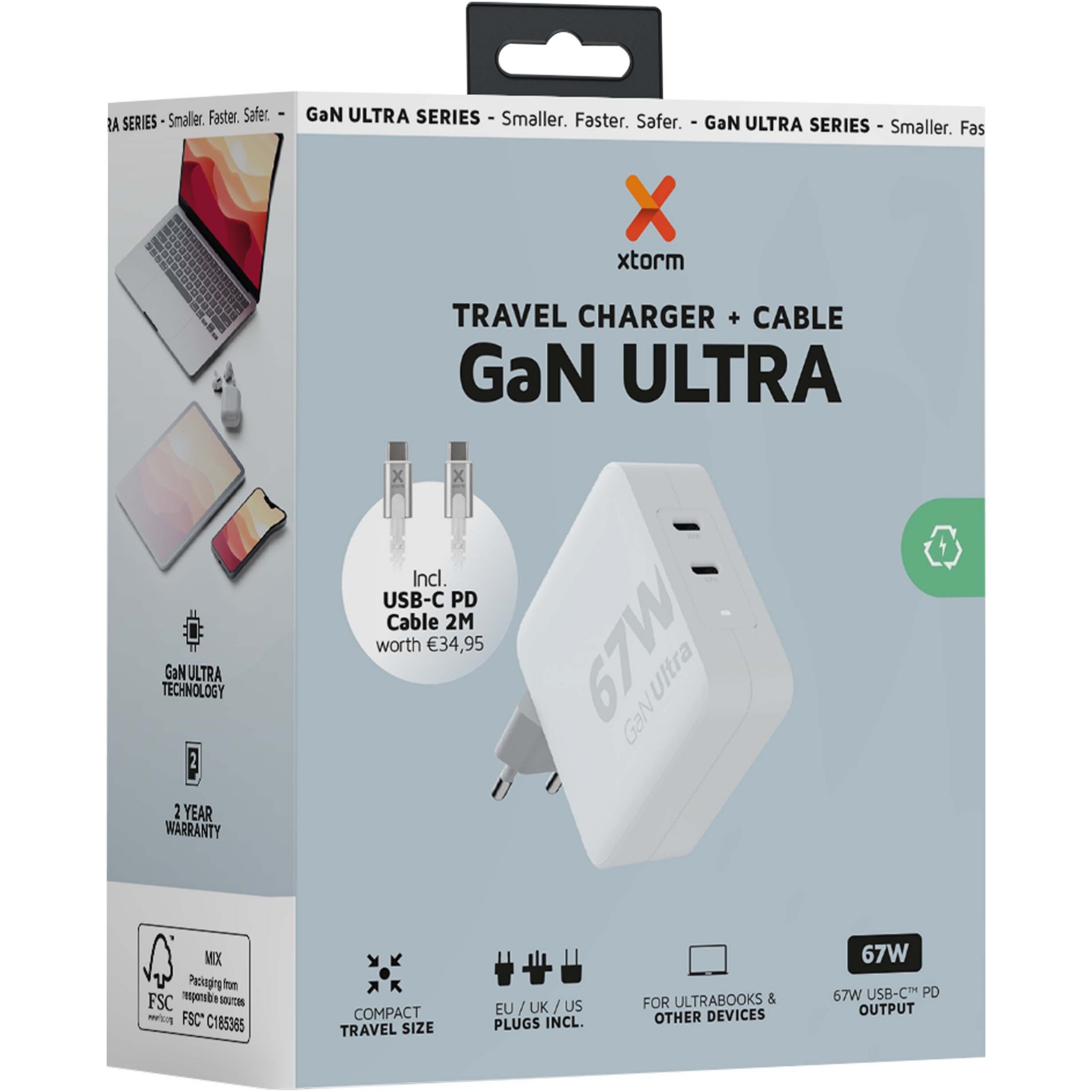 The 67W GaN Ultra travel charger is designed to be more compact and powerful than ever before. With its compact design and dual-port functionality, this travel charger is perfect for your travels, office, or home. With the included EU, UK, and US, AC plug options and the 100W USB-C PD cable (2 metres), you have everything you need to charge your devices all over the world!