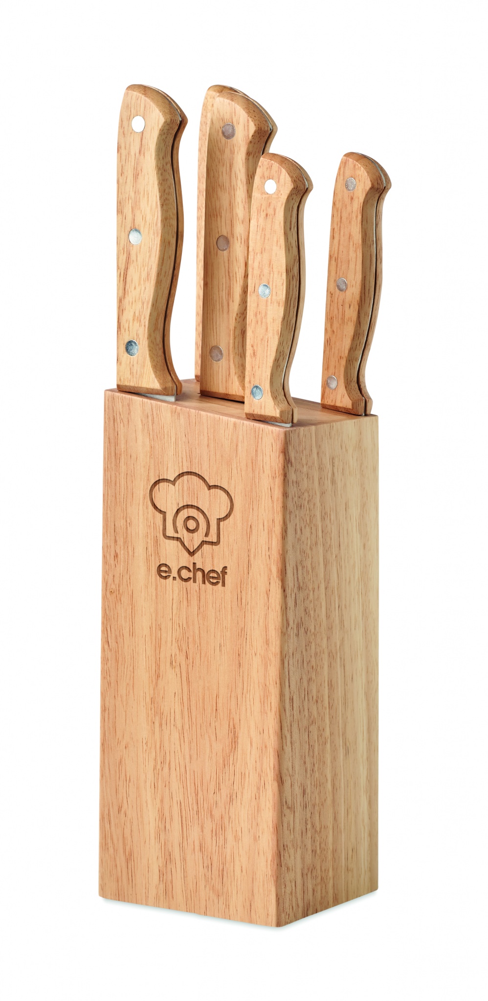 Puidust nugade komplekt. Sisaldab alushoidjat ja 5 nuga: kokk, leib, viilutamine, multifunktsionaalne ja lõikamine. Roostevaba teras puidust käepidemega.