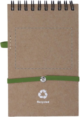 Taaskasutatud paberist märkmik koos sobiva pliiatsiga. Kahejuhtmeline. 140 tavalist taaskasutatud paberilehte (70 lehte). Sobiv nupuga pastapliiats taaskasutatud karbis ja biolagunevas plastis. Sinine tint. Elastne sulgemisrihm ja pliiatsihoidja.