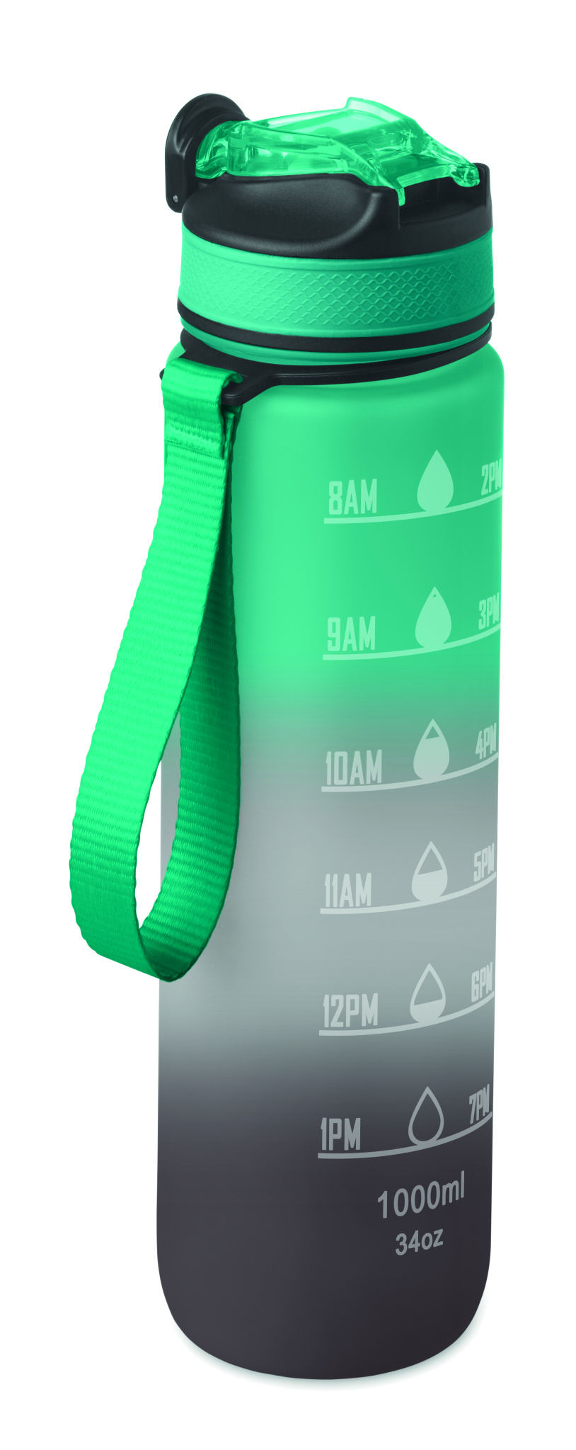 Spordiveepudel RPET-st integreeritud kõrre, pehme silikoonist huuliku, motiveeriva ajamärgistuse, ühe käega avatava klapiga kaane, turvaluku ja kanderihmaga. Mahutavus 1L.