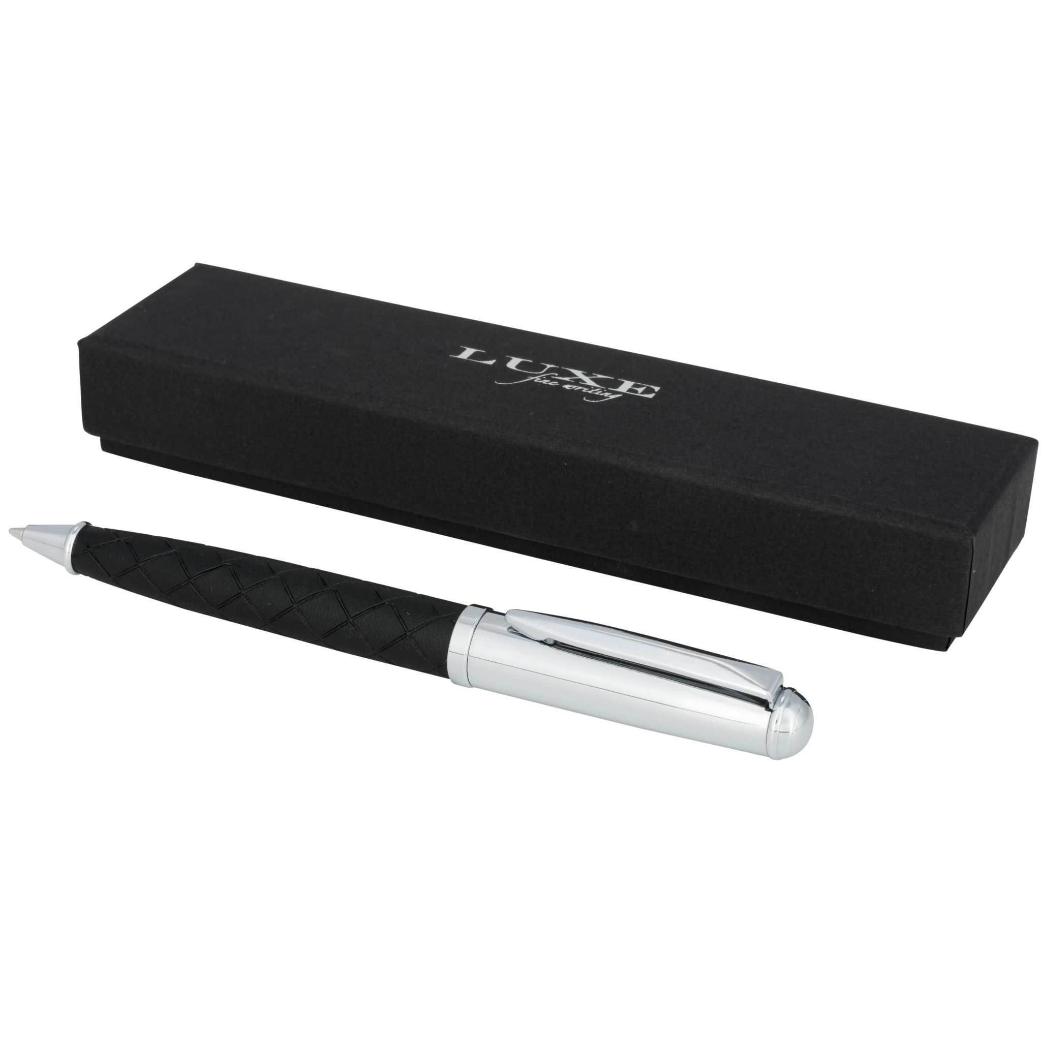 Eksklusiivse disainiga pastapliiats, nahaga ümbritsetud alumine silinder, millel on ristjooneline muster. Sisaldab esmaklassilist musta täitematerjali ja pakitud ''LUXE'' kinkekarpi (16x4,5x2,5cm).