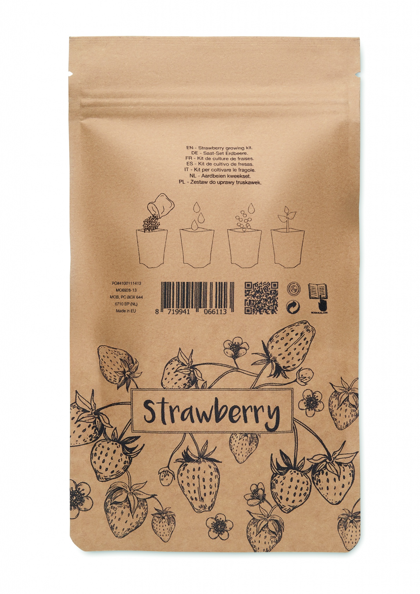 Maasikakasvatuskomplekt, mis sisaldab aiakomposti paberpakendis. Valmistatud EL-is.
