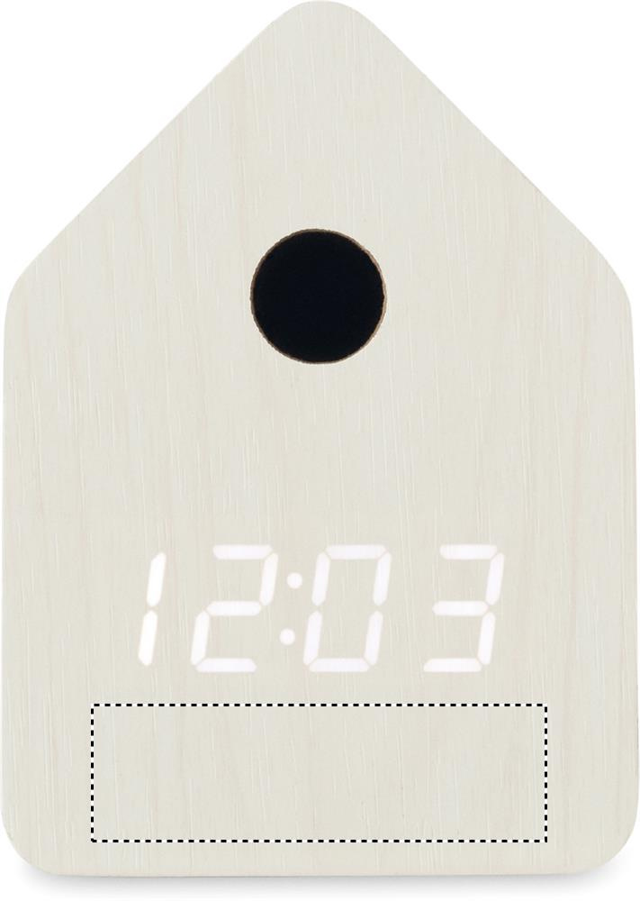 Väike MDF-ist lauakell sisseehitatud äratuskellaga, millel on käo hääl, koos temperatuurinäidikuga. Käo hääl iga täistunni ja äratuse ajal. Valge LED-ekraan. Heli vaigistatakse automaatselt kella 22.00 ja 06.00 vahel. 5-minutilised edasilükkamise intervallid.