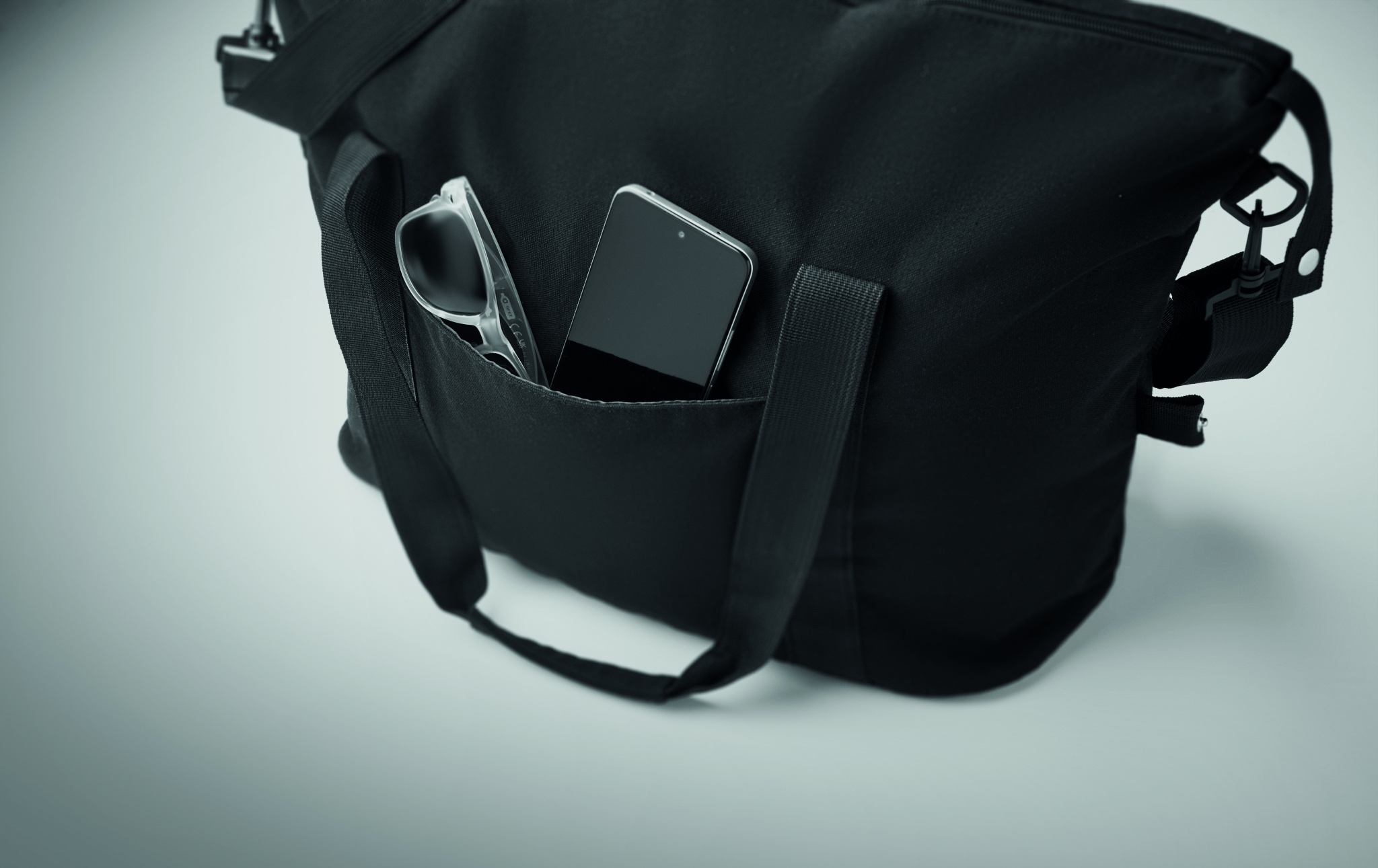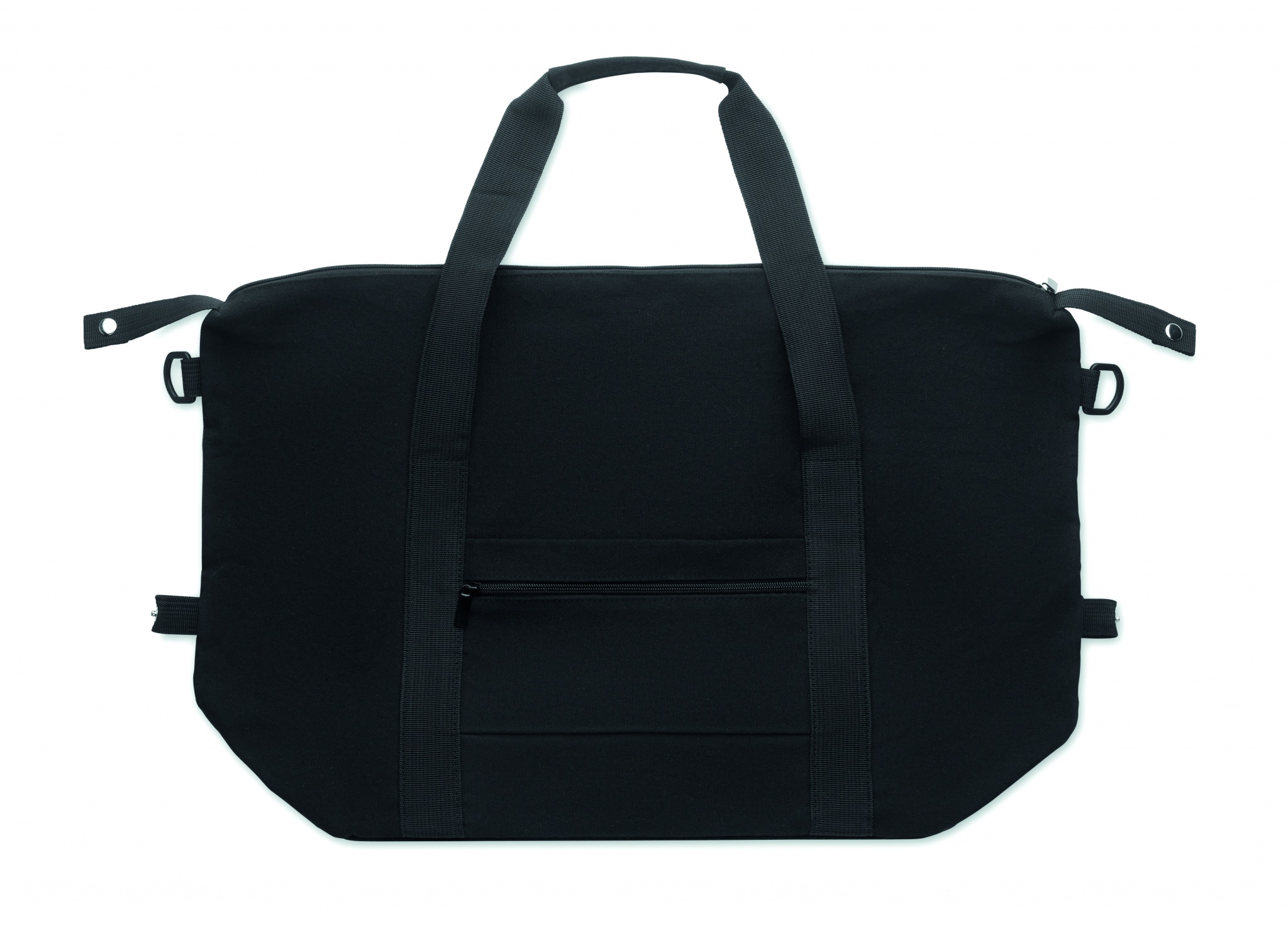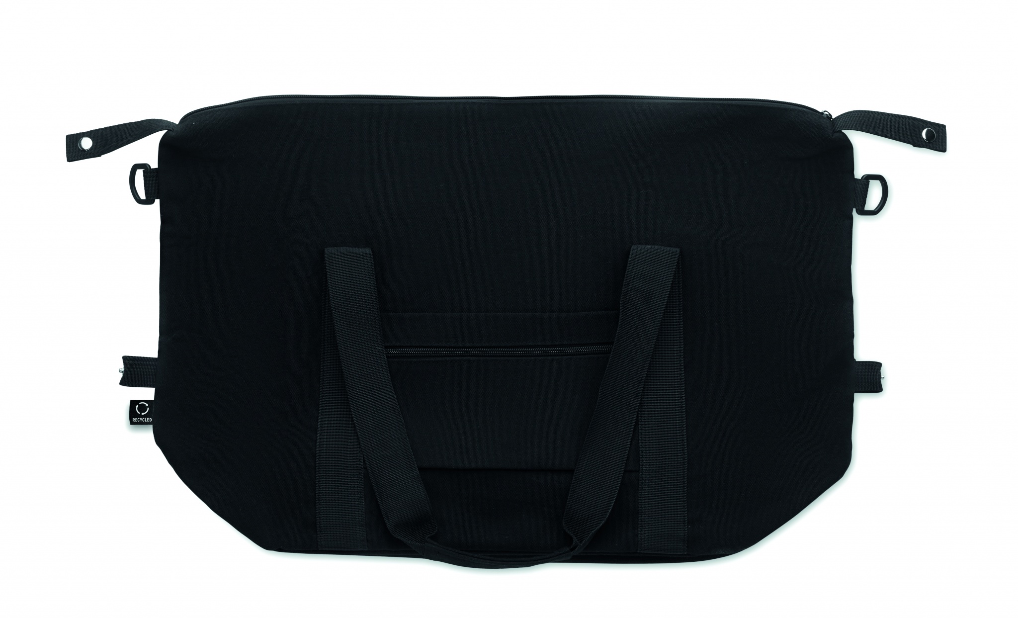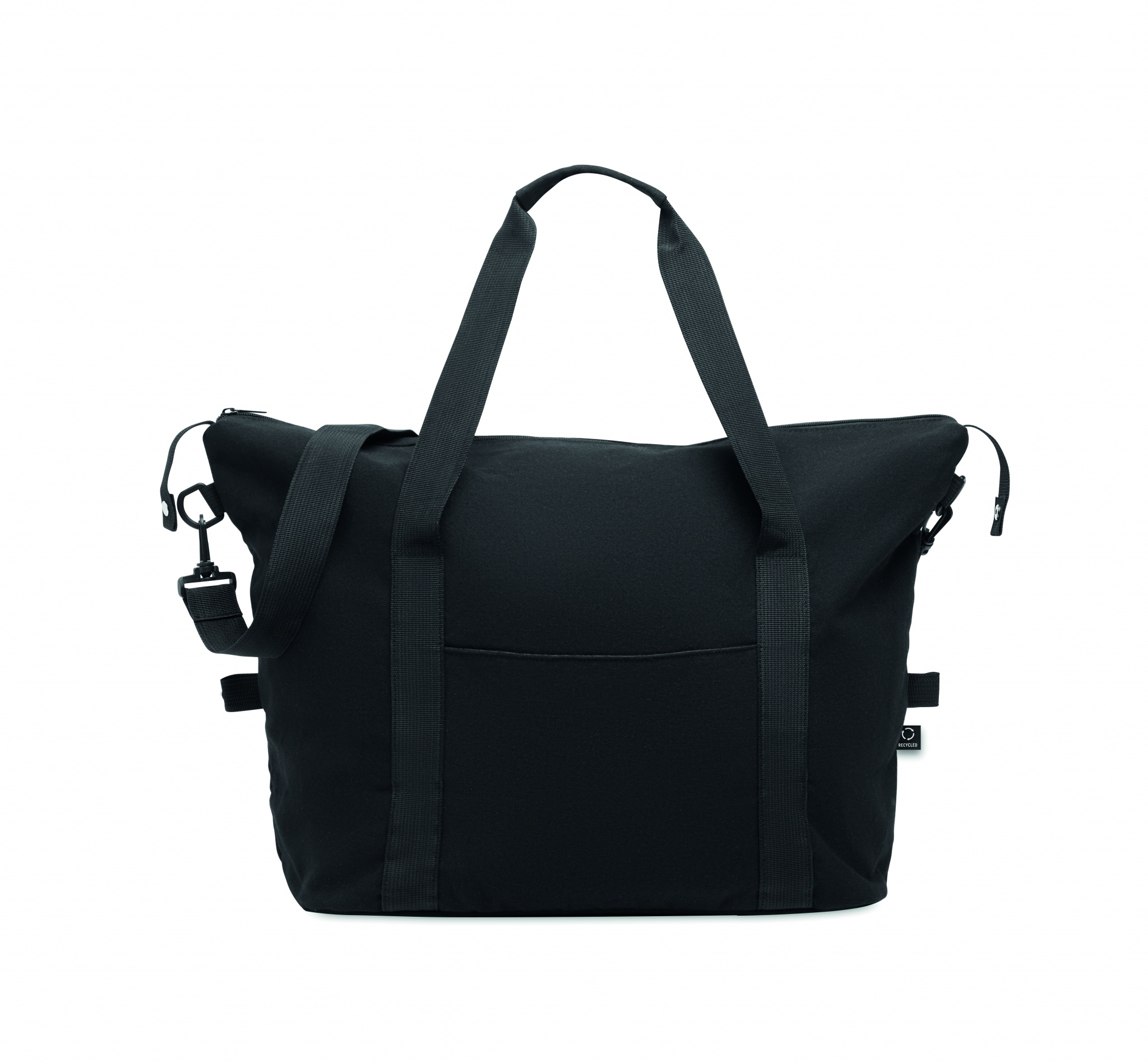 Nädalavahetusekott taaskasutatud tarbimiseelsest puuvillast ja taaskasutatud polüestrist (70%/30%), voodriga 210D RPET polüester. Sellel on eesmine tasku, lukuga tagatasku, eemaldatav ja reguleeritav õlarihm ning polsterdatud põhi. Käru hoidik tagaküljel.