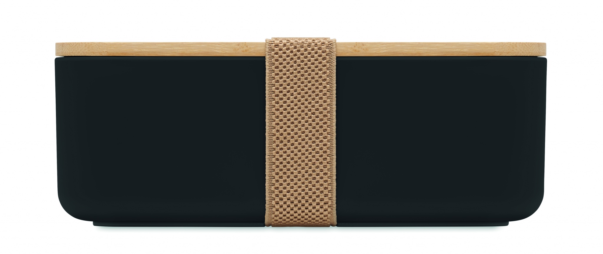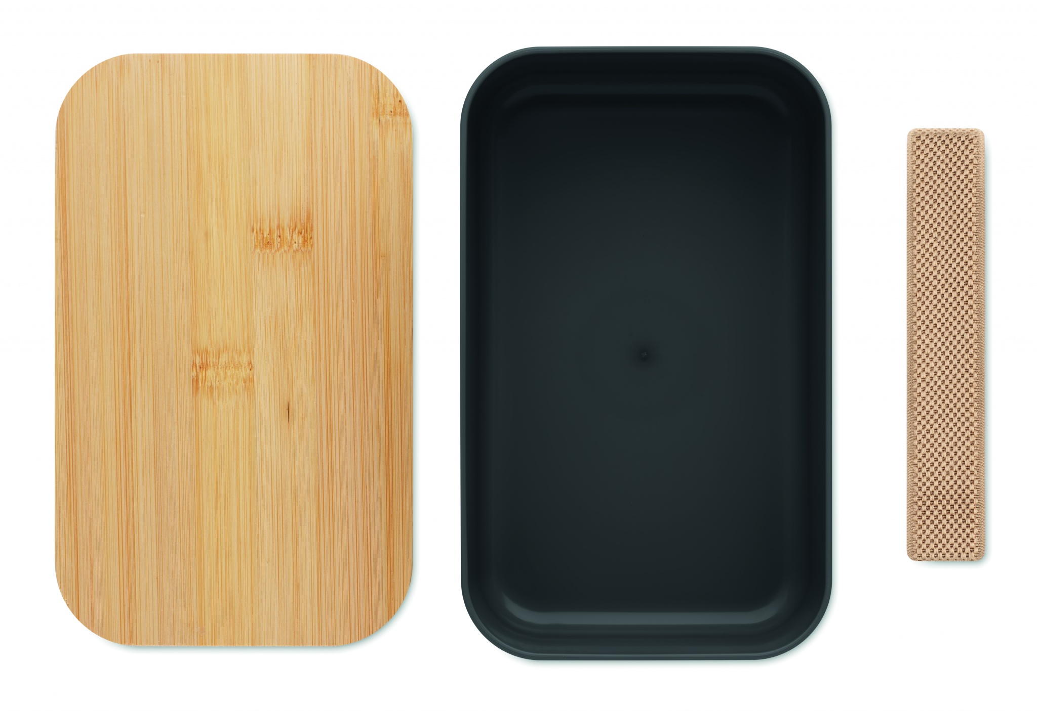 100% PLA maisist lõunasöögikarp bambusest kaane ja RPET elastse riba sulgemisega. Mahutavus: 1000 ml.