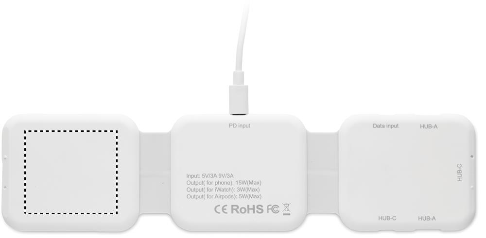 Magnetiline laadimisjaam ABS-plastist. 3 juhtmevaba laadimiskohaga. 1 x 15 W, 1 x 5 W TWS-i jaoks ja 1 Apple Watchi laadija (3 W). 2 Type-C ja 2 USB-A jaoturit. Integreeritud kaabli sisend: Type-C ja USB-A ühenduspesa.