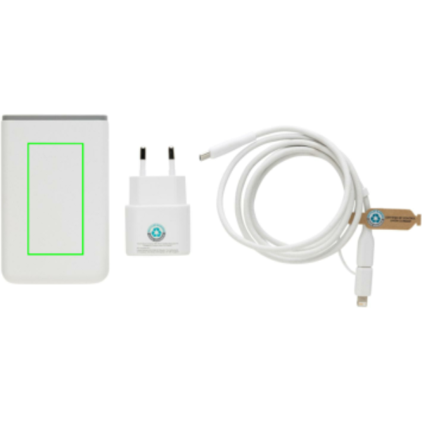 3 tk 20W kiirlaadimiskomplekt mobiilseadmetele ja muudele väikeseadmetele. EL-i adapteriga 20 W USB C-pordi, 5000 mAh toitepanga ja 120 cm taaskasutatud TPE 60 W kiirlaadimiskaabliga (USB C-st USB-le / Lightning). Kaabel toetab andmeedastust ja ka suuremate seadmete nagu sülearvutite laadimist. Adapter, toitepank ja kaabel on valmistatud RCS-sertifikaadiga taaskasutatud arvutist, ABS-ist ja taaskasutatud TPE-st. Pakitud RCS-sertifikaadiga taaskasutatud PET-st valmistatud kotti. Kogu komplekti taaskasutatud sisaldus: 59% eseme kogukaalust. RCS-sertifikaat tagab taaskasutatud materjalide täielikult sertifitseeritud tarneahela. Pakitud FSC® pakendisse. PVC vaba. Sisend seinalaadija AC 100-240V 50/60Hz 0,6A; Väljundseinalaadija USB-C: 5,0V⎓3,0A,9,0V⎓2,22,12,0V⎓1,67A (max 20W). Väljundtoitepank 5V⎓2,4A -USB-C sisend: 5V⎓2,4A