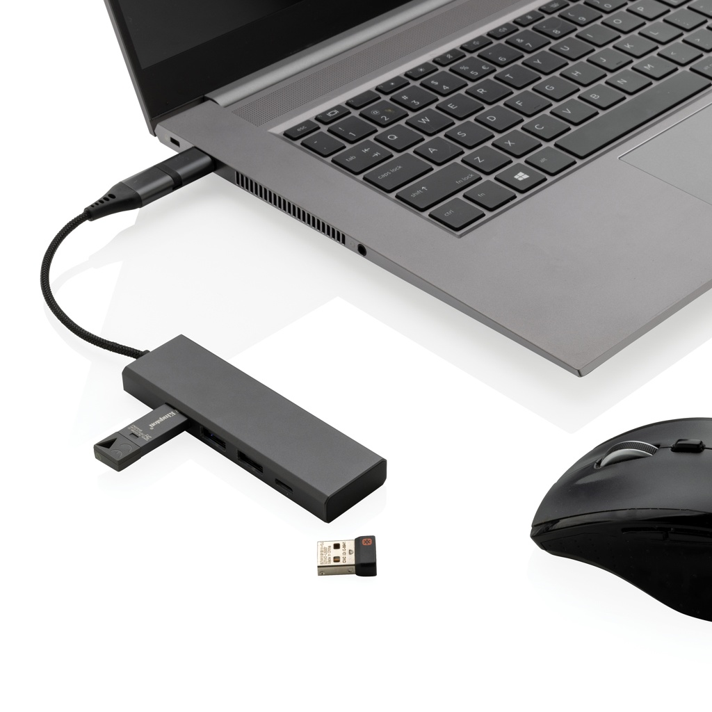 Alumiiniumist USB-jaotur, mis on valmistatud RCS-i (Recycled Claim Standard) sertifitseeritud taaskasutatud alumiiniumist, ABS-ist, TPE-st ja PET-st. 3 USB A 2.0 pordi ja 1 C-tüüpi pordiga. HUB-il on integreeritud 10 cm kaabel, mis on valmistatud taaskasutatud RCS-sertifikaadiga TPE/PET materjalist. Taaskasutatud kogusisaldus: 75% eseme kogukaalust. RCS-sertifikaat tagab taaskasutatud materjalide täielikult sertifitseeritud tarneahela. Kahe sisendiga pistikuga, seega sobib nii C-tüüpi kui ka USB A-tüüpi arvutitele. Alumiinium ei kaota ringlussevõtu käigus oma omadusi ja seda saab ringlusse võtta lõputult. Toode ja tarvikud 100% PVC-vaba. Pakitud FSC segupakendisse.