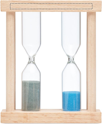 Puinen kaksiosainen tiimalasisetti, jossa on kaksi eri ajastinta (n.3 ja 5 minuuttia)