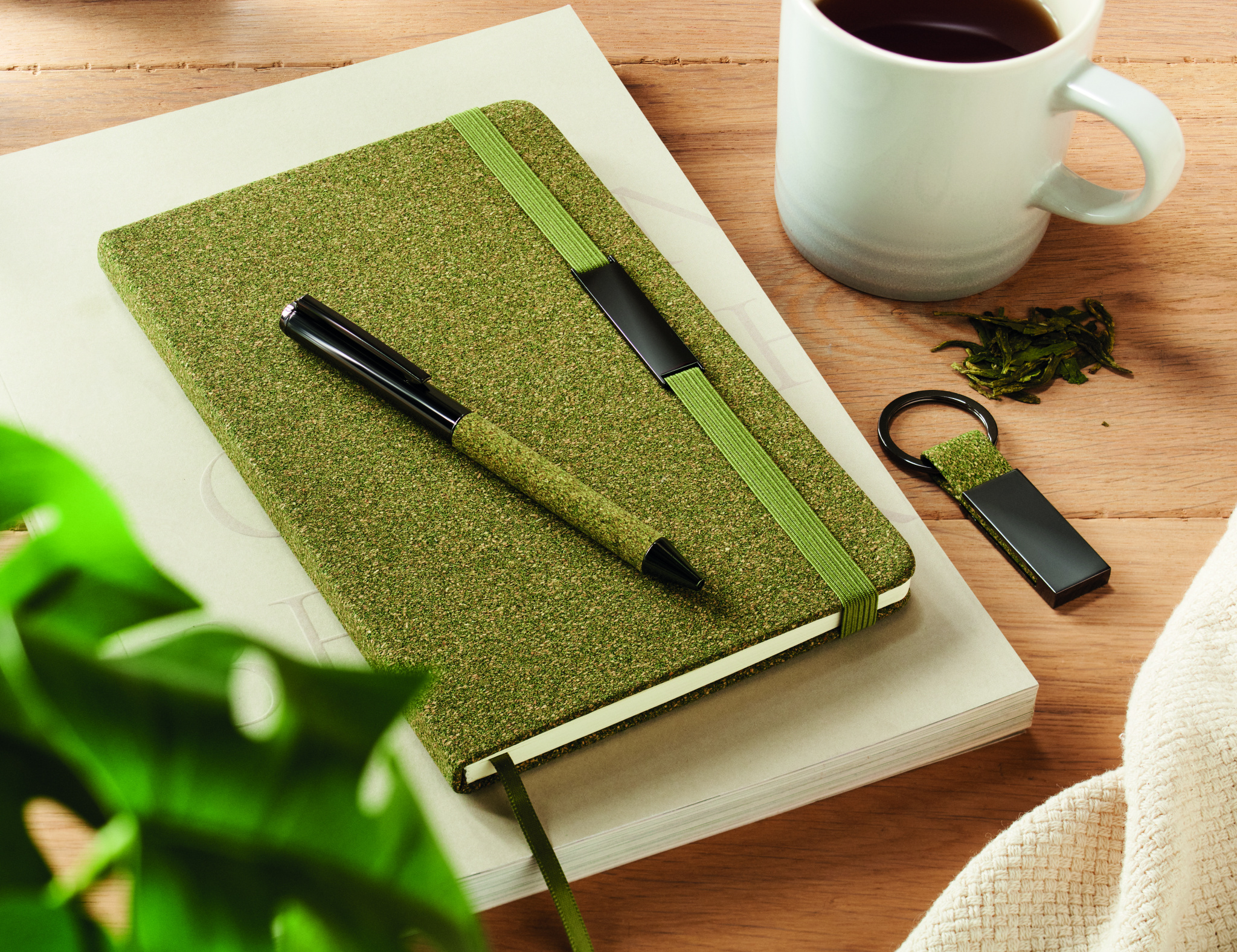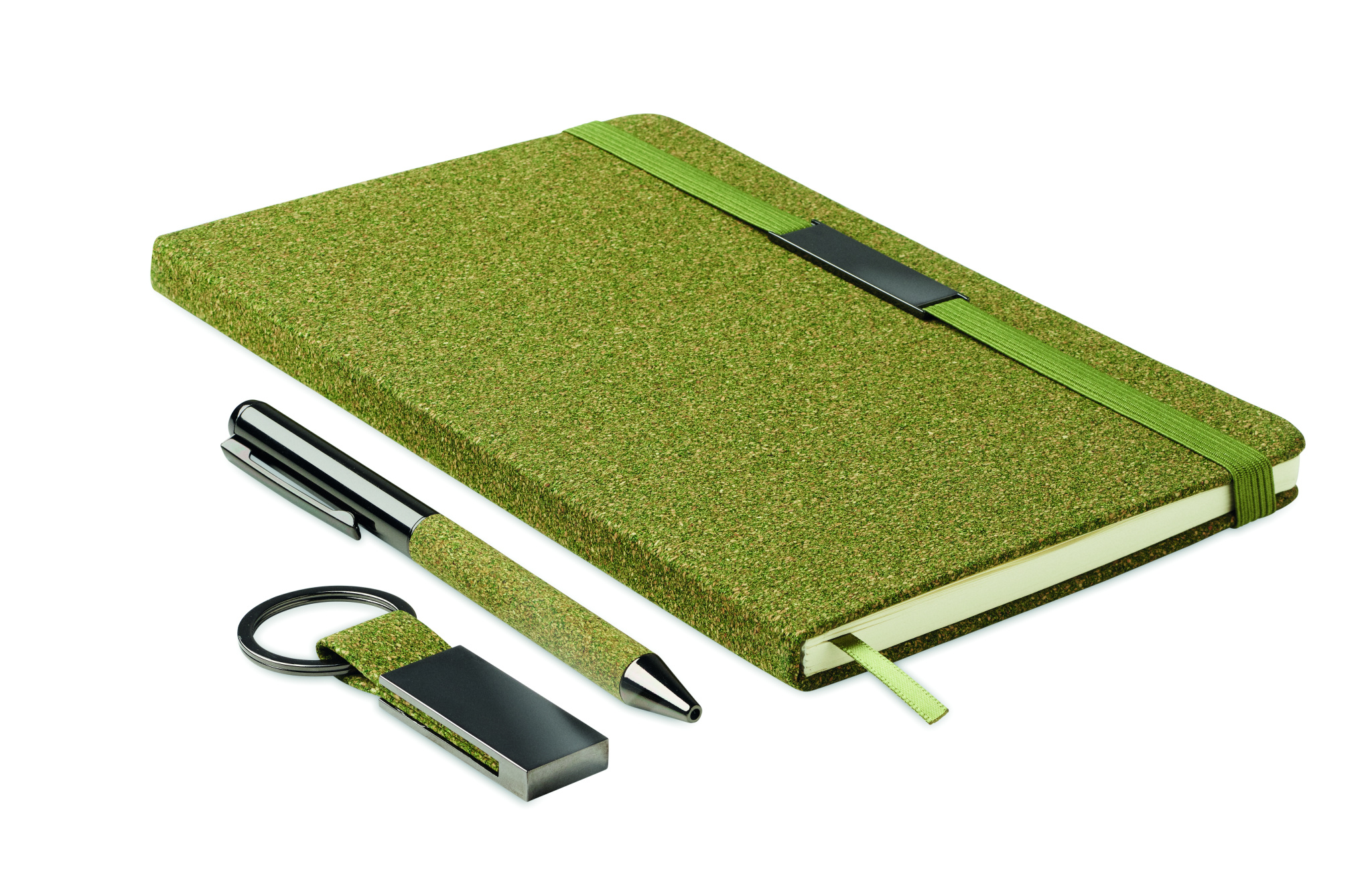 Kovakantinen A5-muistikirja, 160 viivoitettua kierrätyspaperisivua (80 arkkia/70 g/m²), kierretty metallinen kuulakynä ja avaimenperä. Yksityiskohdat on valmistettu 20 % teenporoista, 30 % korkista, 50 % polypuuvillakankaasta. Metalliset yksityiskohdat kuminauhassa . FSC®-certified | FSC MIX CREDIT, N7.1, FSC-C213206