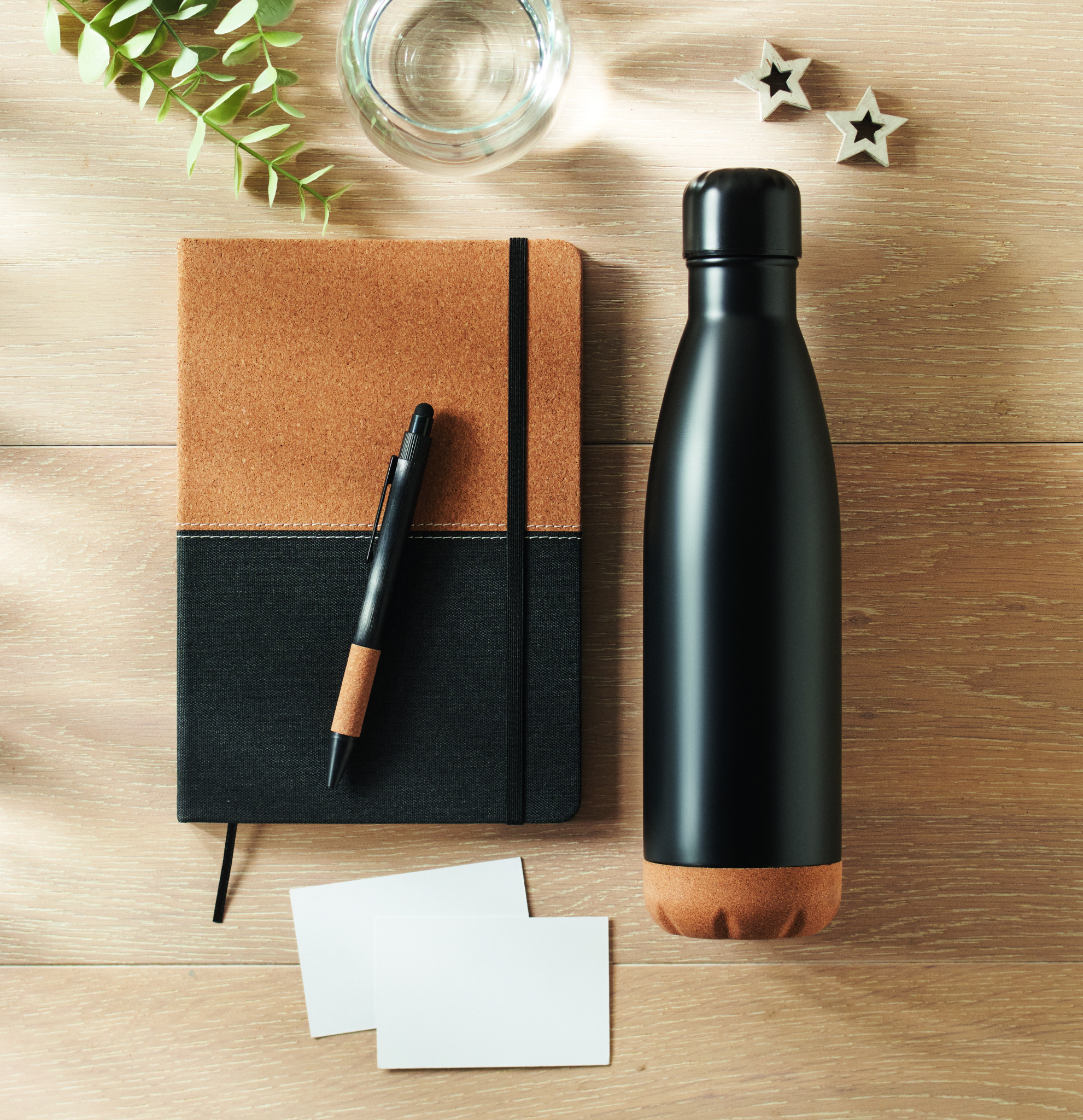 3-osainen lahjasetti, joka sisältää kaksiseinäisen ruostumattomasta teräksestä valmistetun eristetyn pullon 500 ml, A5-muistikirjan, jossa on kova kansi RPET:ia ja korkkia, 160 viivoitettua kierrätyspaperisivua (80 arkkia) ja alumiininen kuulakynä. Sininen muste. FSC®-certified | FSC MIX CREDIT, P7.1, N3.7, FSC-C213206