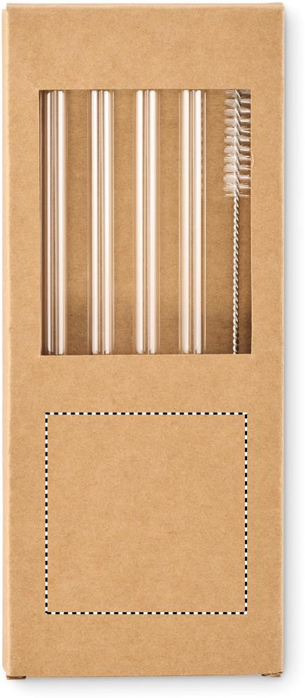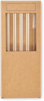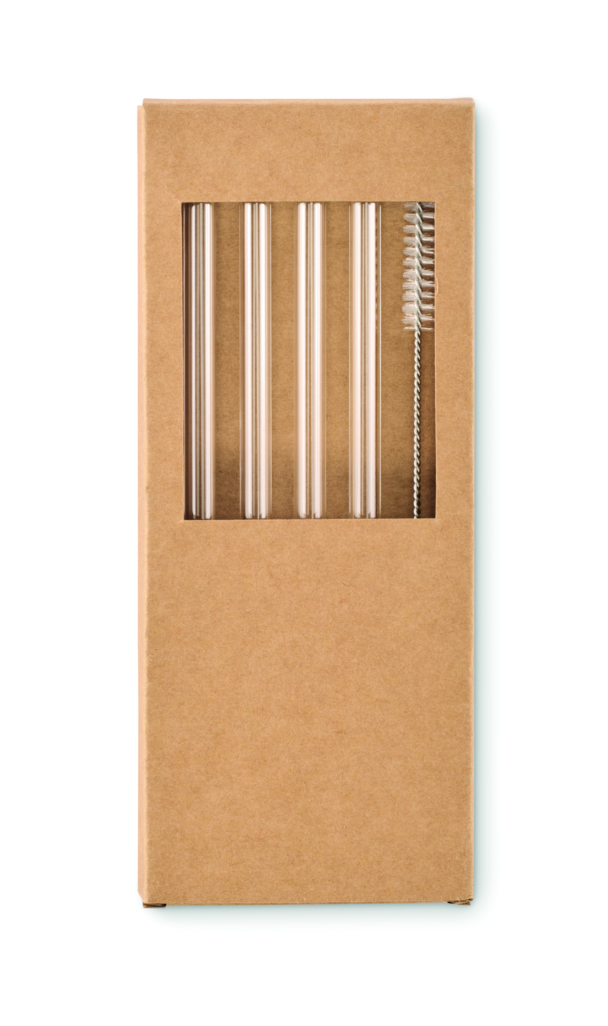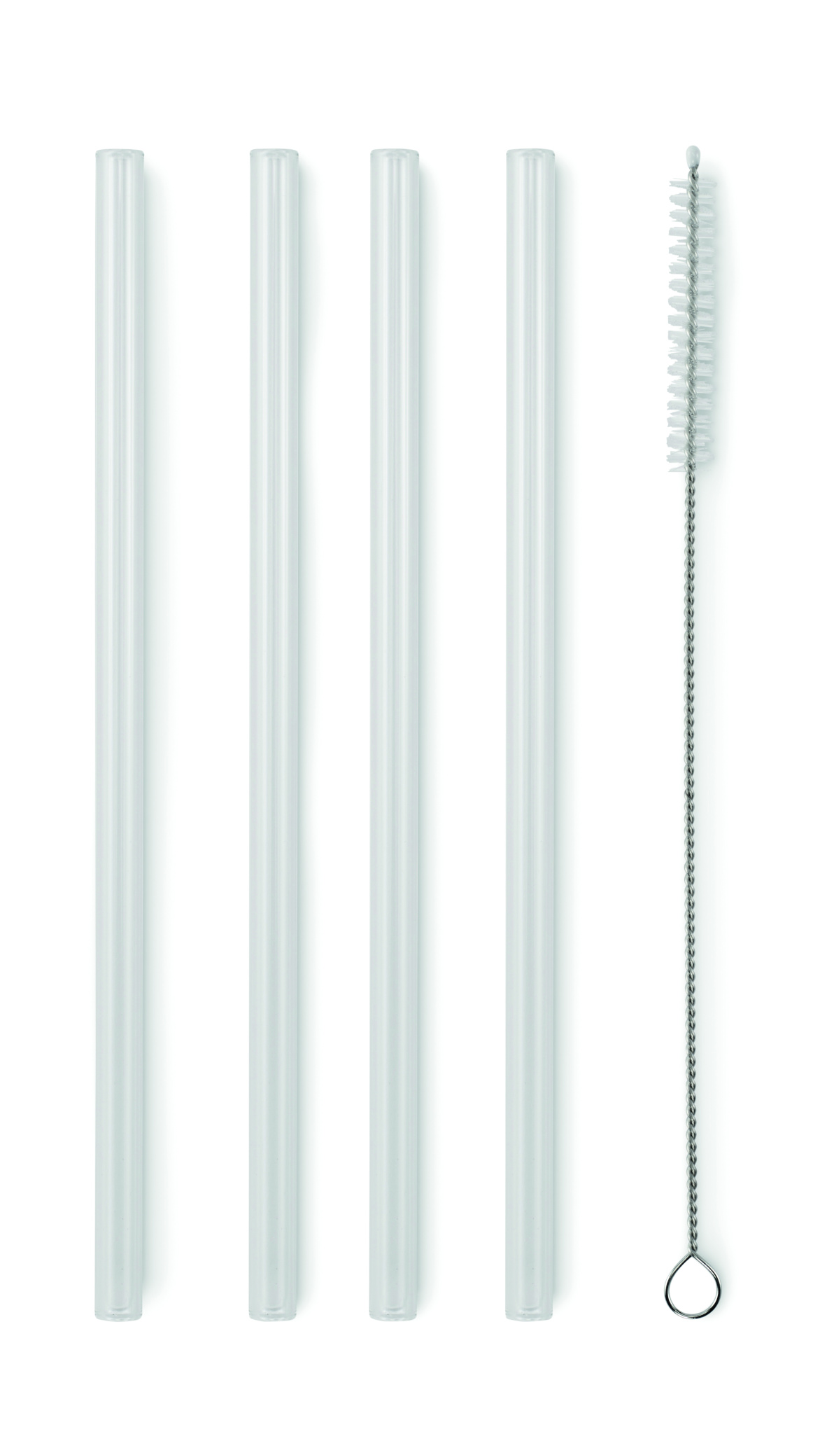 Pakkauksessa 4 uudelleenkäytettävää pilliä korkeaborosilikaattilasista ja 1 puhdistusharja.