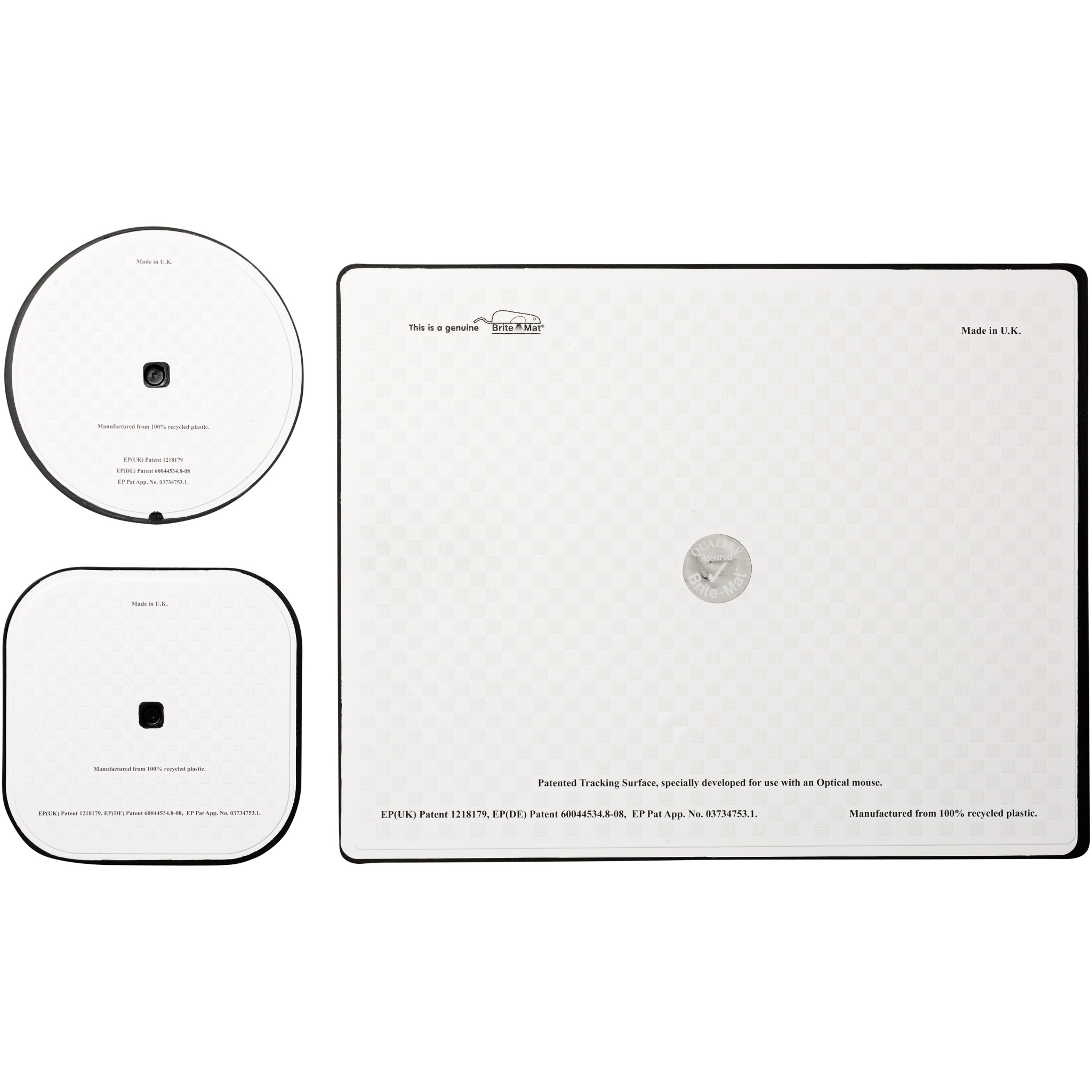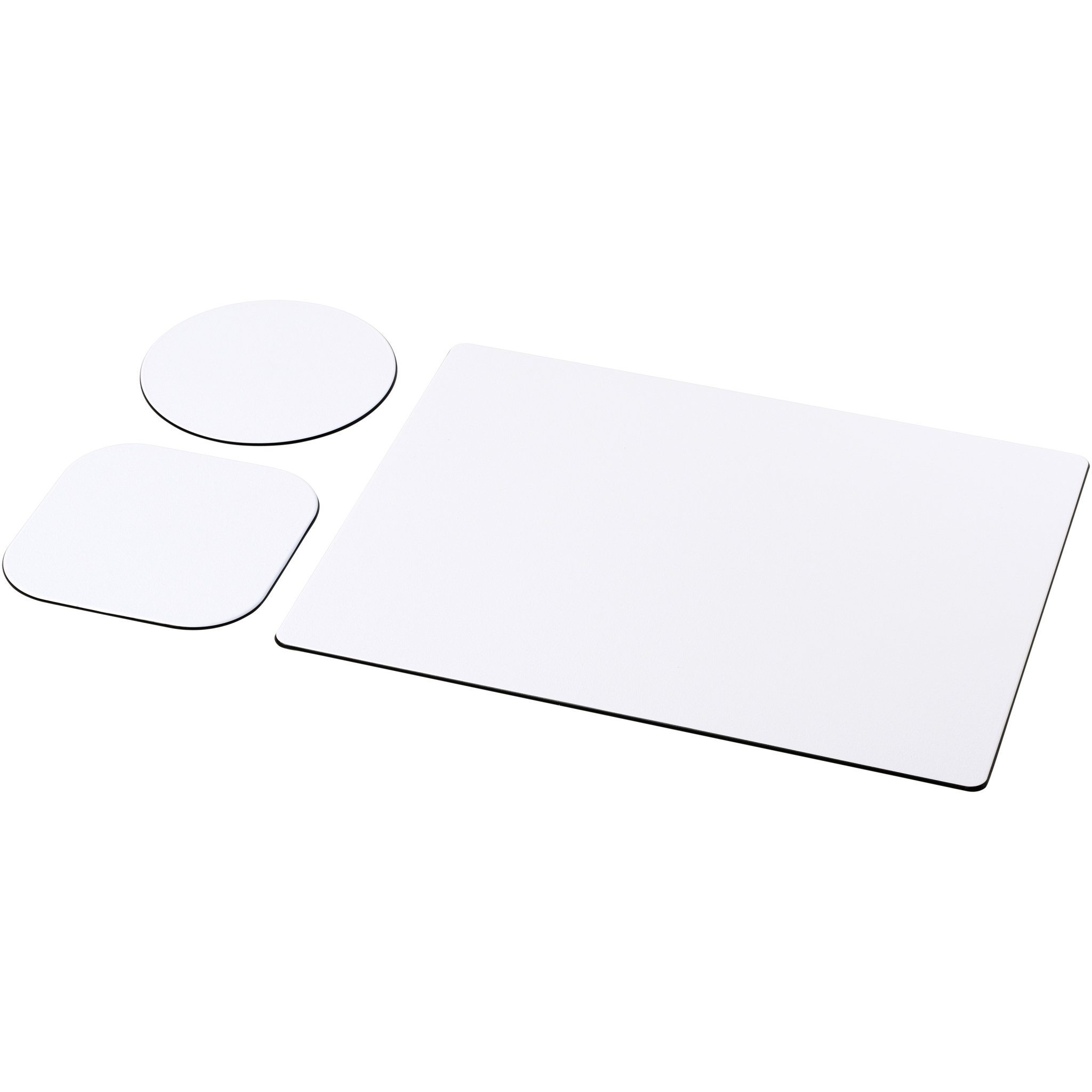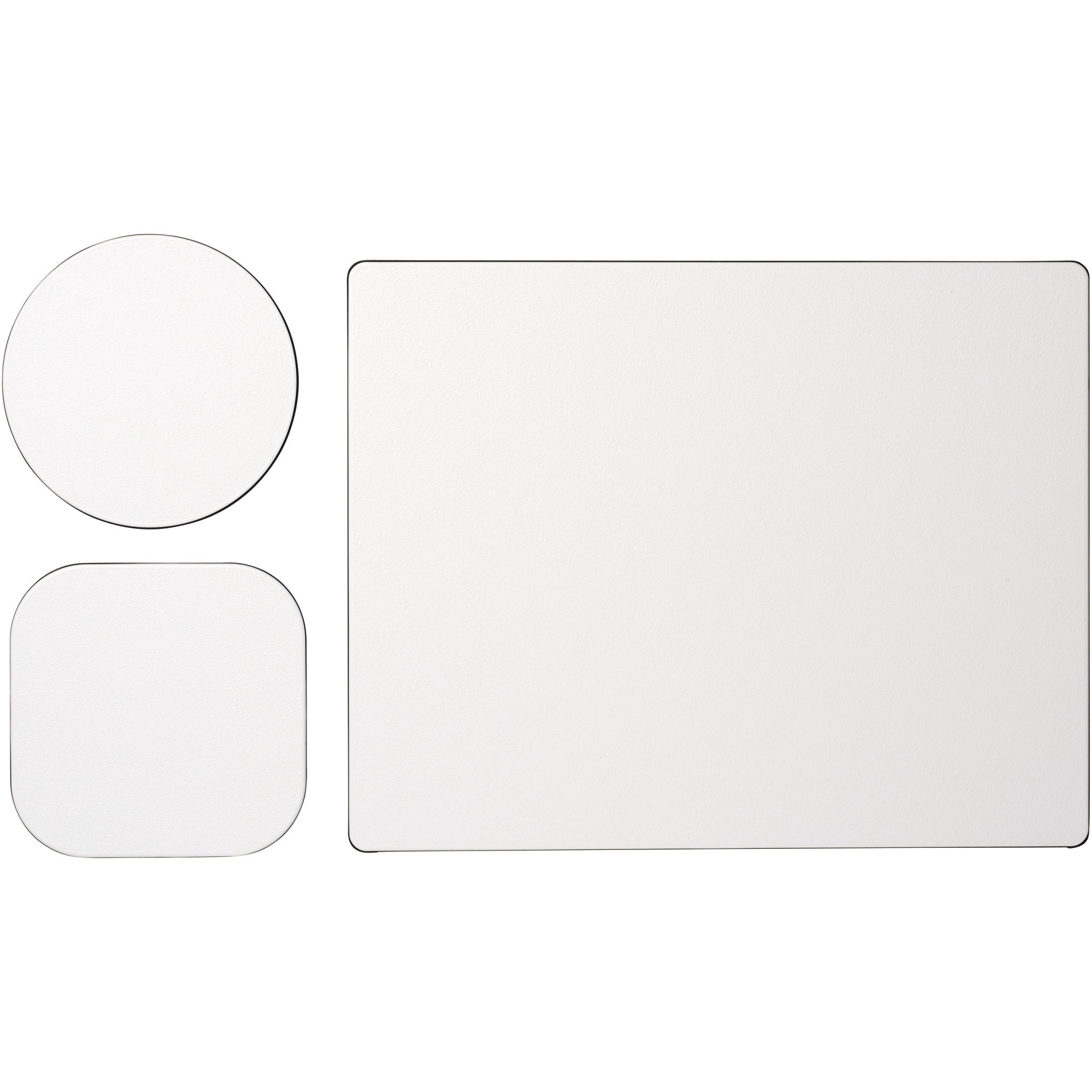 Mukana Brite-Mat-hiirimatto ja setti vastaavia lasinalusia. Settiin kuuluu suorakaiteenmuotoinen hiirimatto (0,3 x 19 x 21 cm), neliönmuotoinen lasinalus (0,3 x 9,5 x 9,5 cm) ja pyöreä lasinalus (0,3 x ø9,5cm).