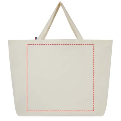 Tämä kassi on valmistettu laadukkaasta 100% kierrätysmateriaalista. 200 g/m² puuvilla/ polyester sekoitemateriaalista valmistettu kassi kestää päivittäistä käyttöä ja sopii raskaiden kirjojen tai ruokaostosten kuljettamiseen, kantokyky 14 kg. Kankaan kuitu on valmistettu Aasiassa, kudonta ja kehräys ja valmistus tehdään Ranskassa.