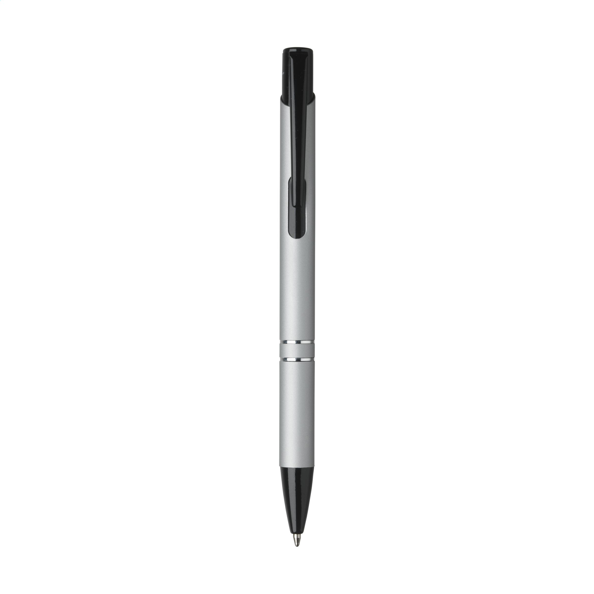 Sinisellä musteella varustettu kuulakärkikynä, jossa mustaksi maalattu painonappi/klipsi ja kärki, kromi lomitukset. Tynnyri on viimeistelty kumipinnoitteella.