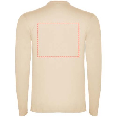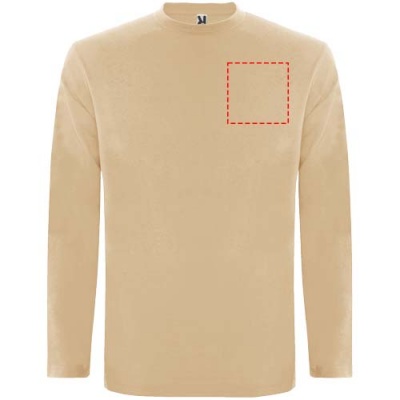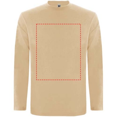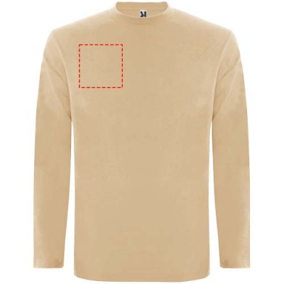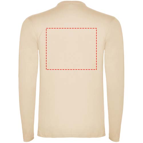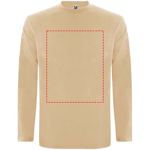 Pitkähihainen tuubikudottu t-paita, nelikerroksinen pyöreä pääntie. Vahvistettu sauma pääntiessä ja olkapäissä. Hihoissa ei ole resoreita. Irrotettava tuotemerkki. Tuubikudottu malli aikuisten koossa ja sivusaumat lasten koossa. Kuvan malli on 185 cm pitkä ja hänellä on päällään koko L.