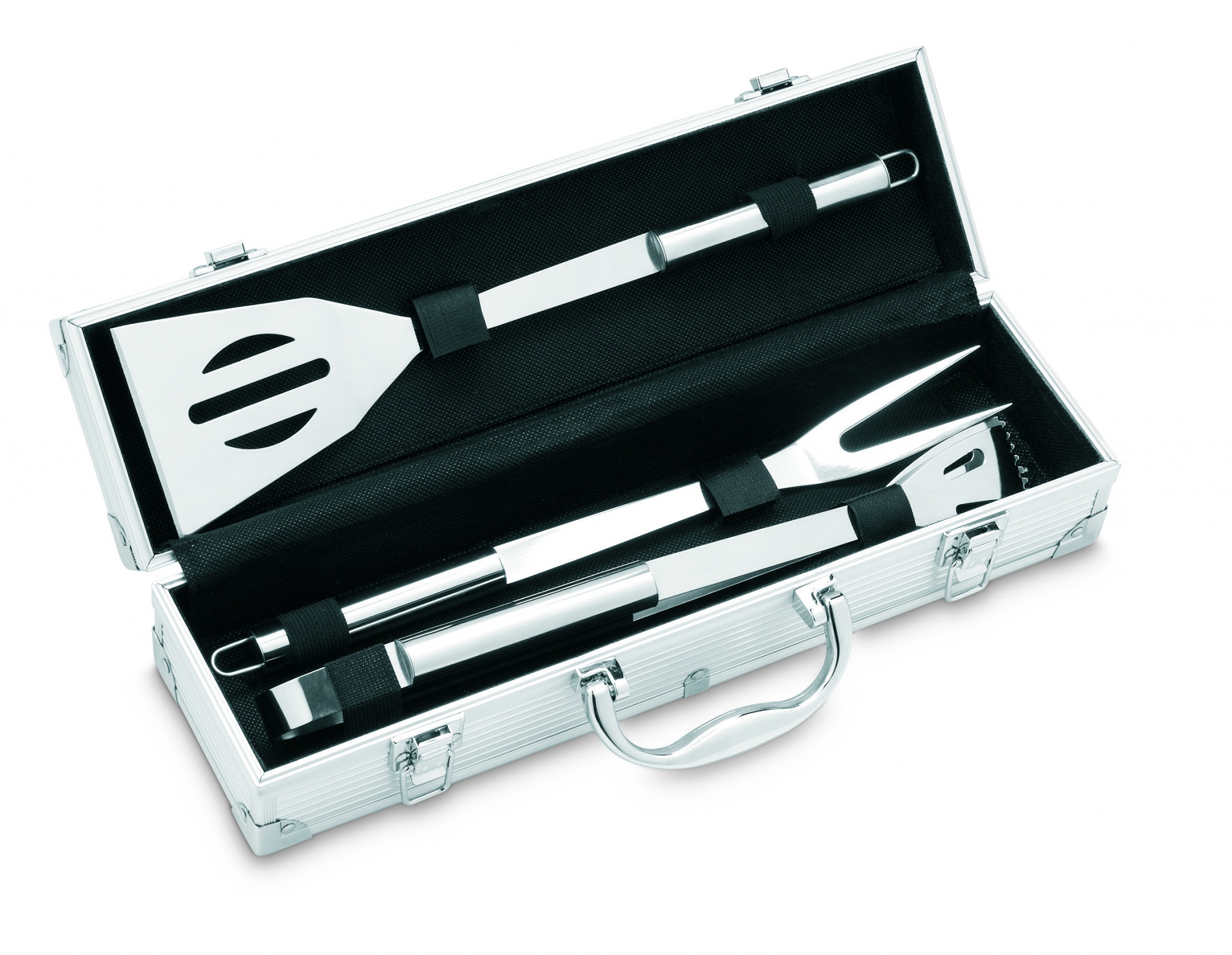 3 osainen grillisetti alumiinilaatikossa, laatikon kannessa levypaikka painatukselle.