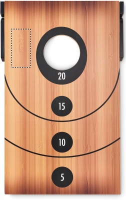 Kaksi puoleinen heittopeli/ tic-tac-toe, sisältää MDF laudan ja 8 heittosäkkiä. Peli, joka tunnetaan yleisesti nimellä Cornhole, on peräisin Pohjois-Amerikasta. Tavoitteena on heittää pienet hiekkasäkit reikään, joka kerta kun säkki menee sisään, ansaitset pisteitä. Henkilö, jolla on eniten pisteitä lopussa tai joka saavuttaa ensimmäisenä tietyn pistemäärän, voittaa. Käännä lauta ympäri pelataksesi klassista tic-tac-toe peliä.