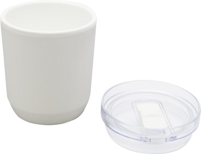 Yksinkertaisesti muotoiltu juomalasi sopii useimpiin kahvinkeittimiin ja auton mukinpidikkeisiin. Siinä on kaksinkertainen seinärakenne, jonka ulko- ja sisäpuoli on kierrätettyä PP-muovia. Liukukansi on valmistettu AS- ja PP-muovista. Tilavuus: 180 ml.