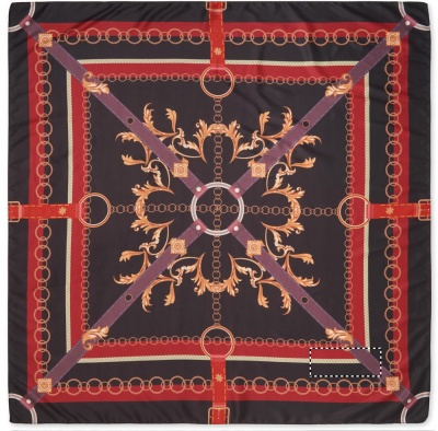 Kierrätyssatiinipolyesteristä valmistettu värikäs huivi, jossa on kuvio.