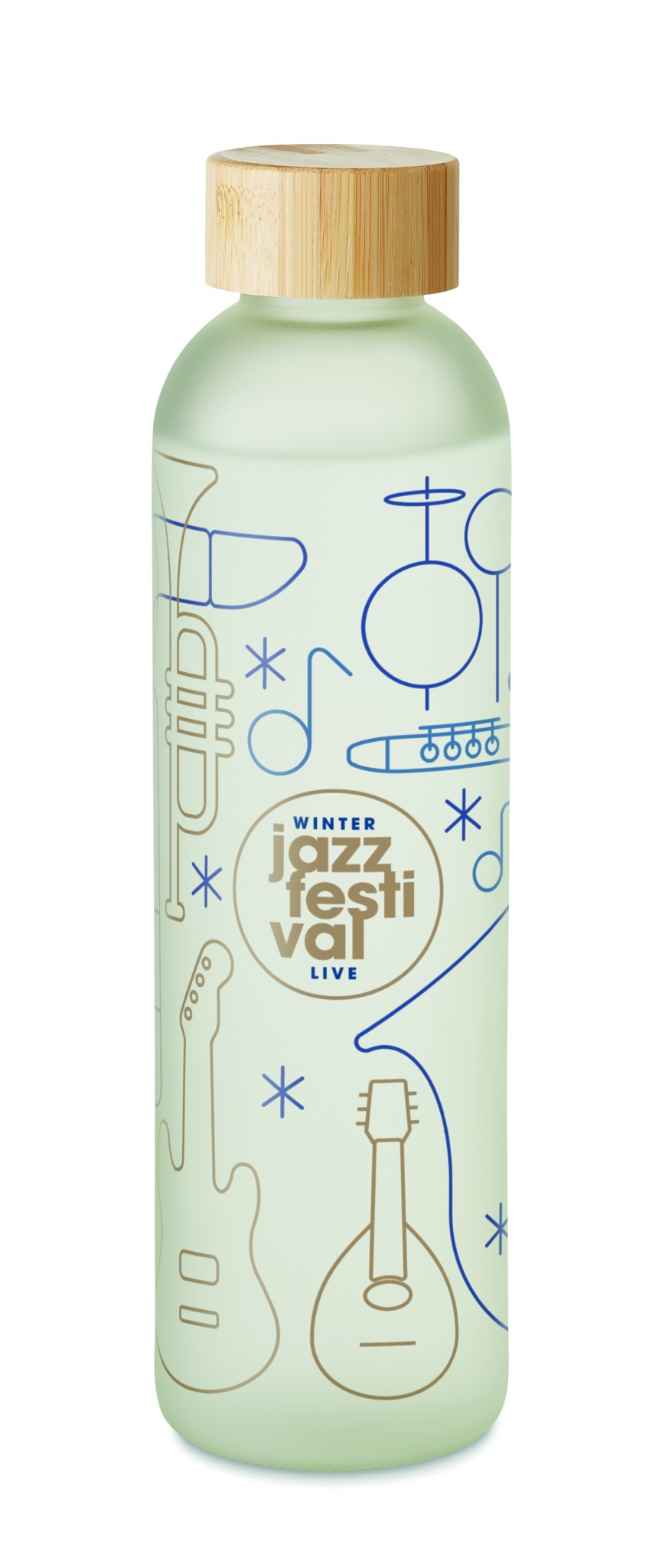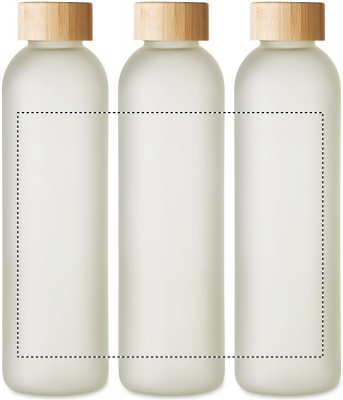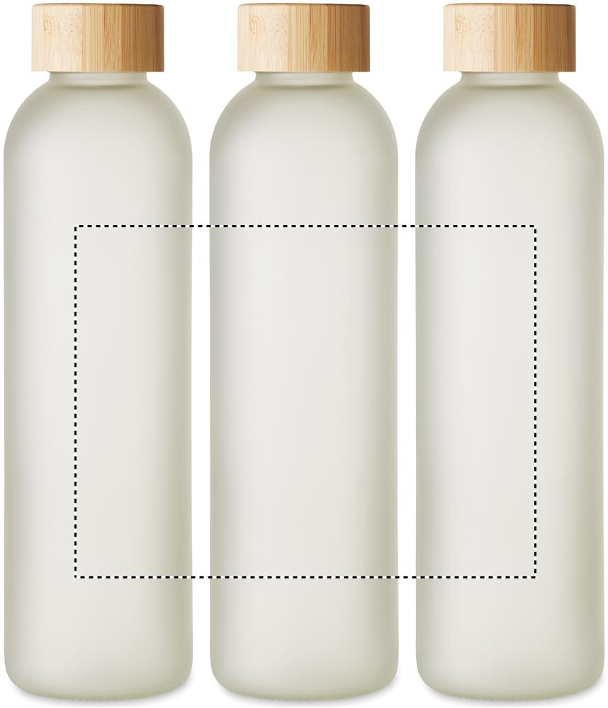 Lasinen juomapullo, jossa on erityinen pinnoite sublimaatiota varten sekä bambukorkki. Tilavuus 650 ml.