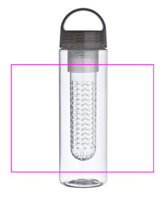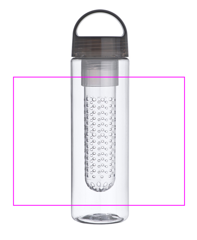 Muovinen juomapullo, jossa infusori (esim.) hedelmille ja tilavuus 650 ml. Painamme logosi pulloon.