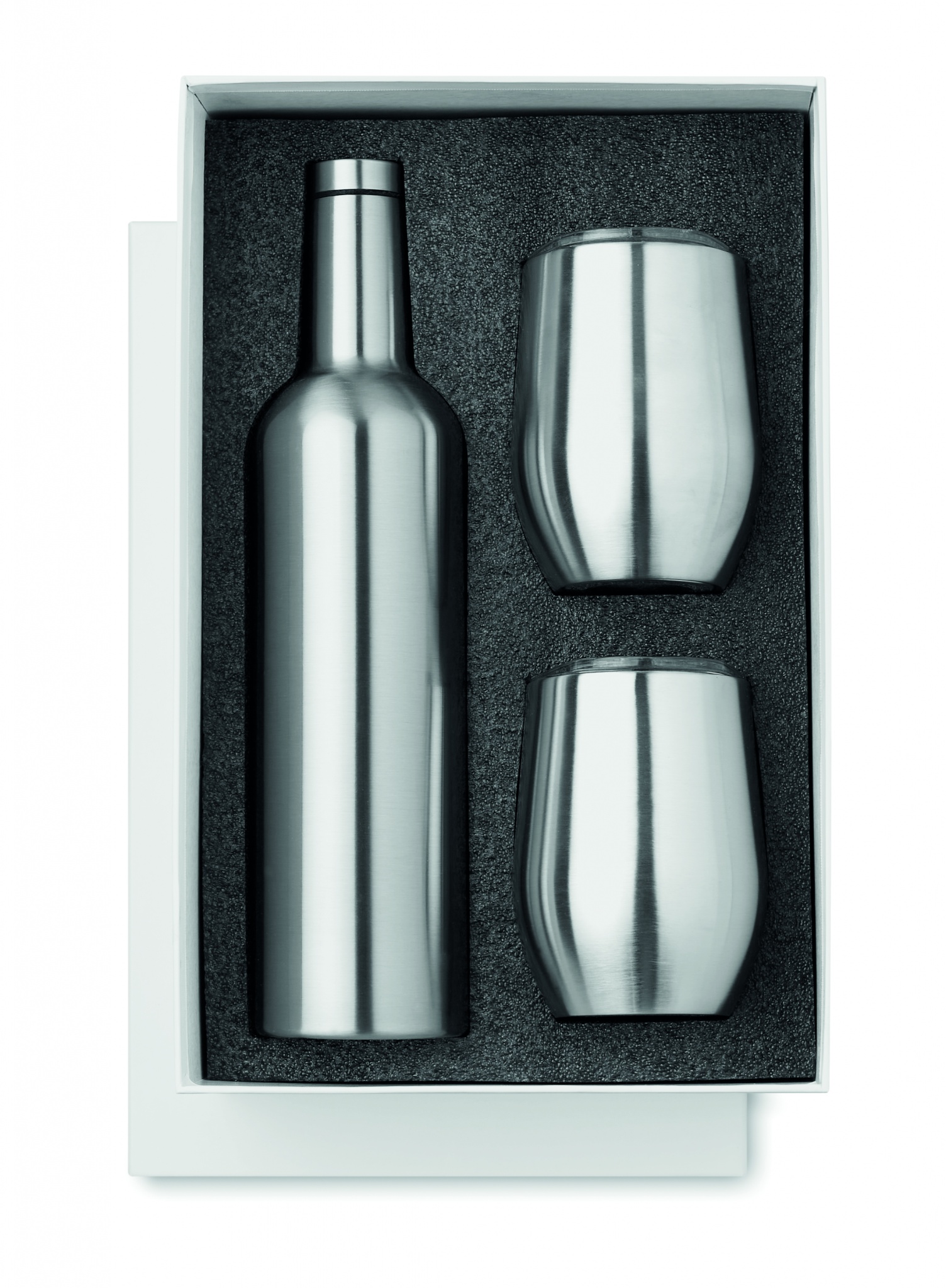 Ruostumattomasta teräksestä valmistettu 750 ml pullo ja 2 x 350 ml mukia, tuotteet ovat vuoto vapaita.