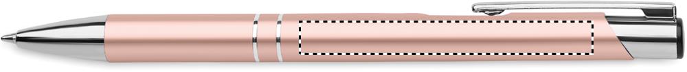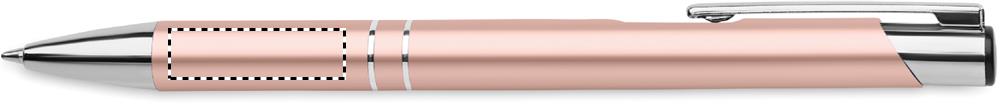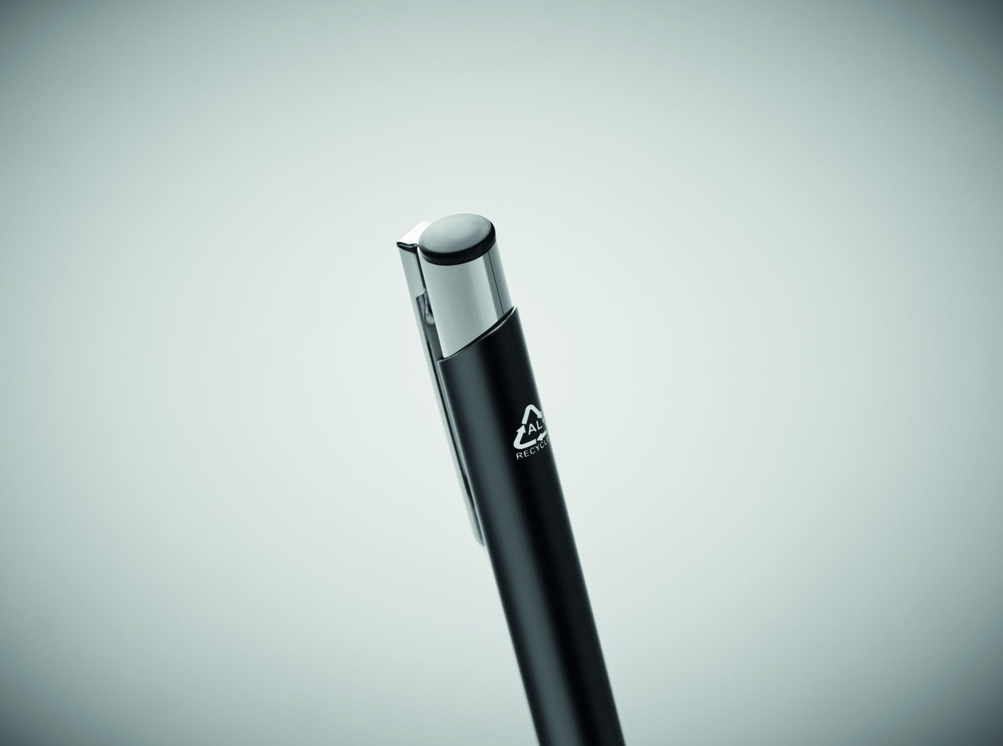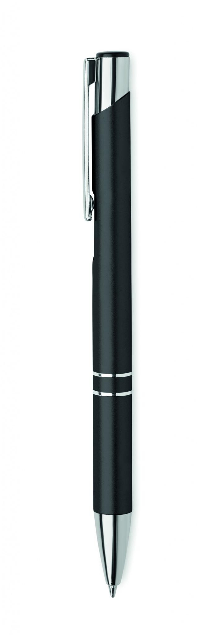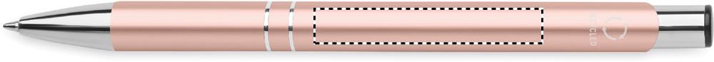 Kierrätetystä alumiinista valmistettu painomekanismilla toimiva kuulakärkikynä sinisellä musteella.