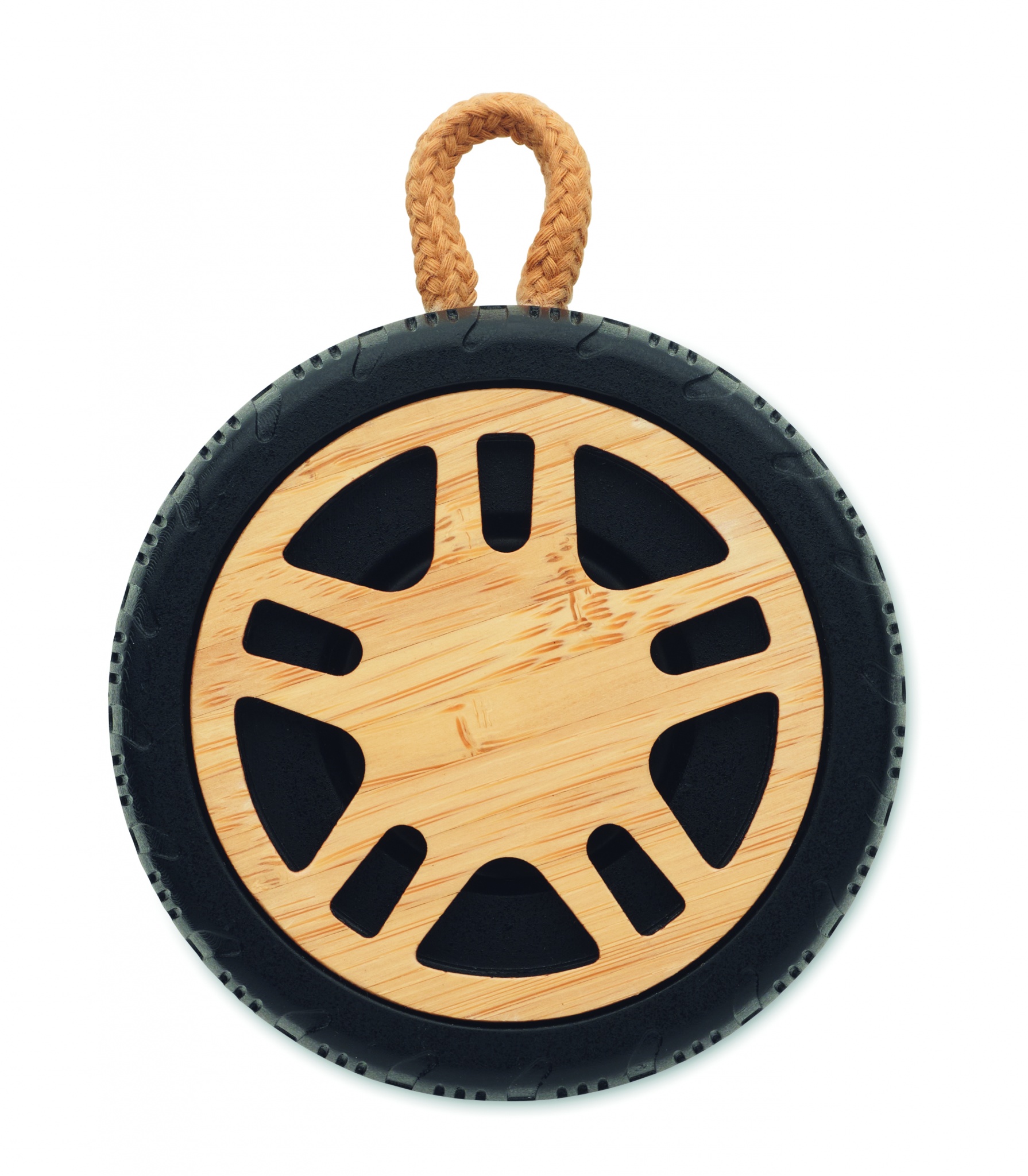 Renkaan muotoinen langaton 5.3-kaiutin kierrätetystä ABS-materiaalista, jossa on bambusta valmistetut yksityiskohdat ja puuvillaköysikahva. 400 mAh:n ladattava akku.
